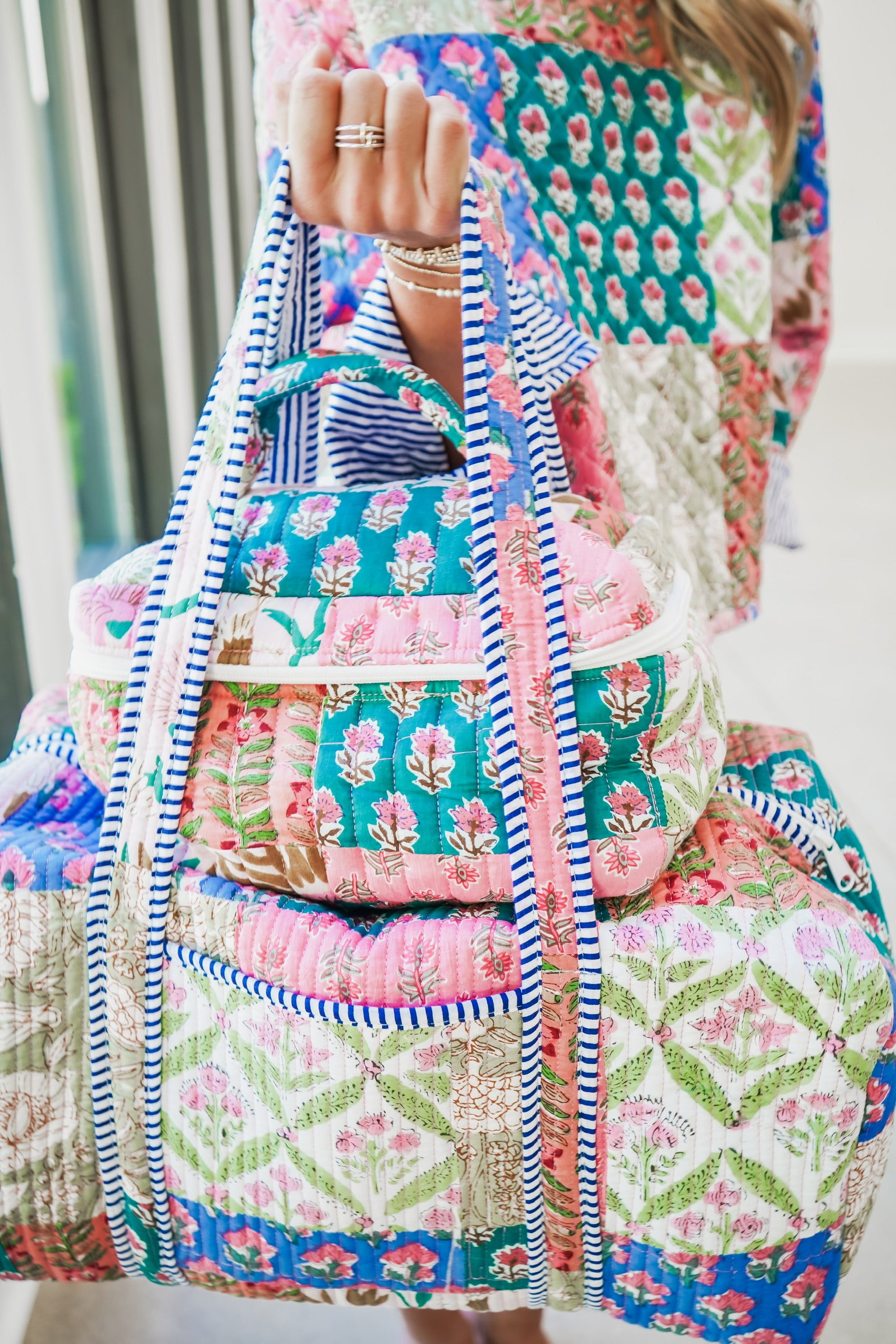 Organize your essentials in style with this quilted toiletry bag. The puffed quilted texture adds dimension and durability, while the all-around outside zipper closure keeps everything secure. A convenient top handle makes it easy to carry, and the striped printed interior adds a pop of personality. Perfect for travel, daily use, or gifting!