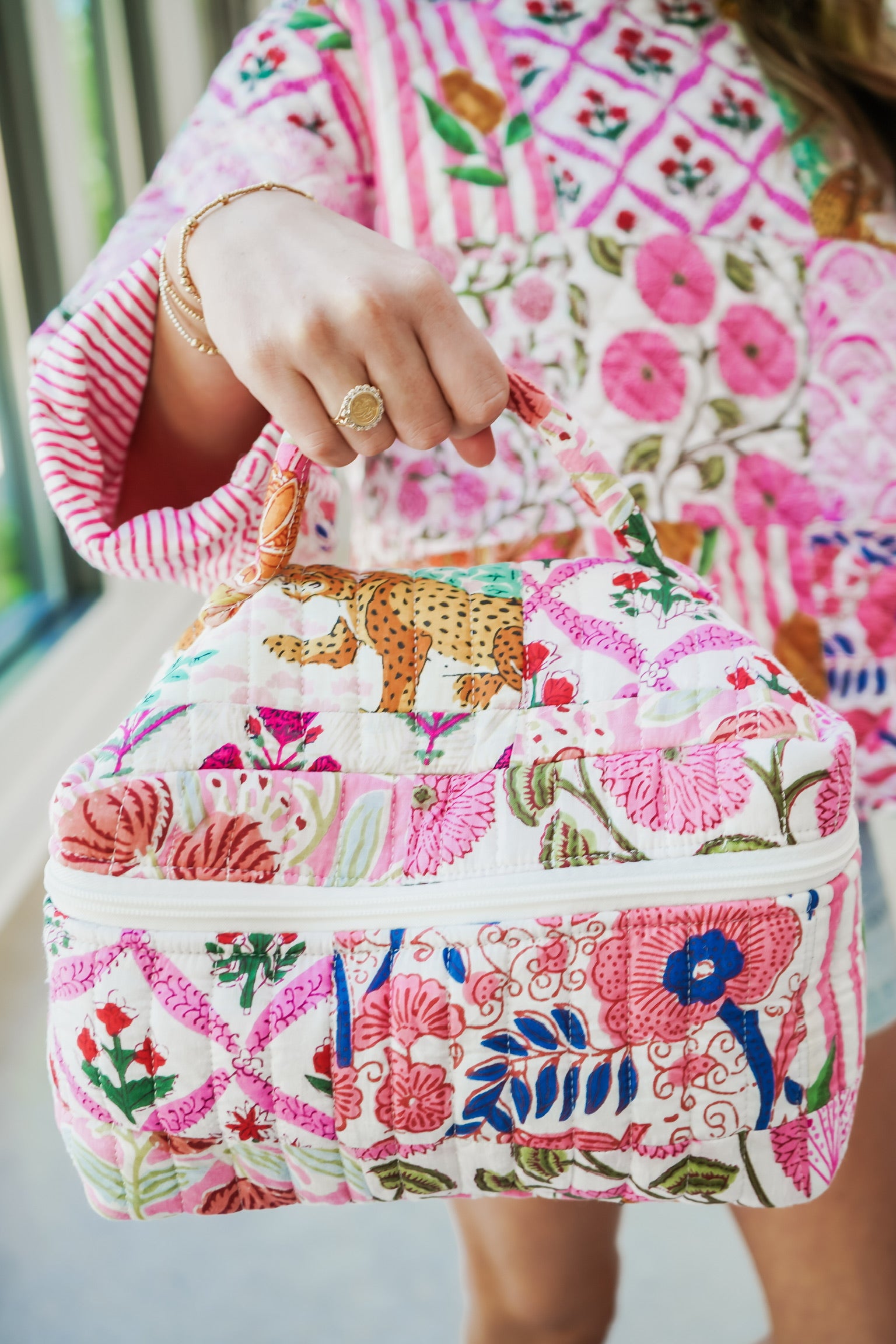 Organize your essentials in style with this quilted toiletry bag. The puffed quilted texture adds dimension and durability, while the all-around outside zipper closure keeps everything secure. A convenient top handle makes it easy to carry, and the striped printed interior adds a pop of personality. Perfect for travel, daily use, or gifting!
