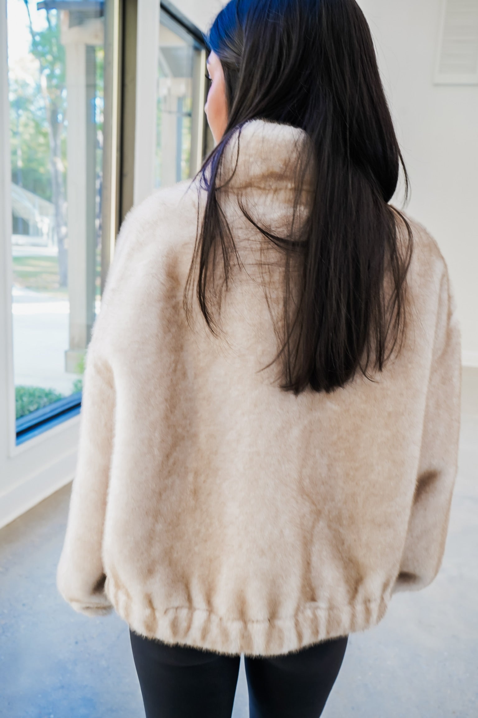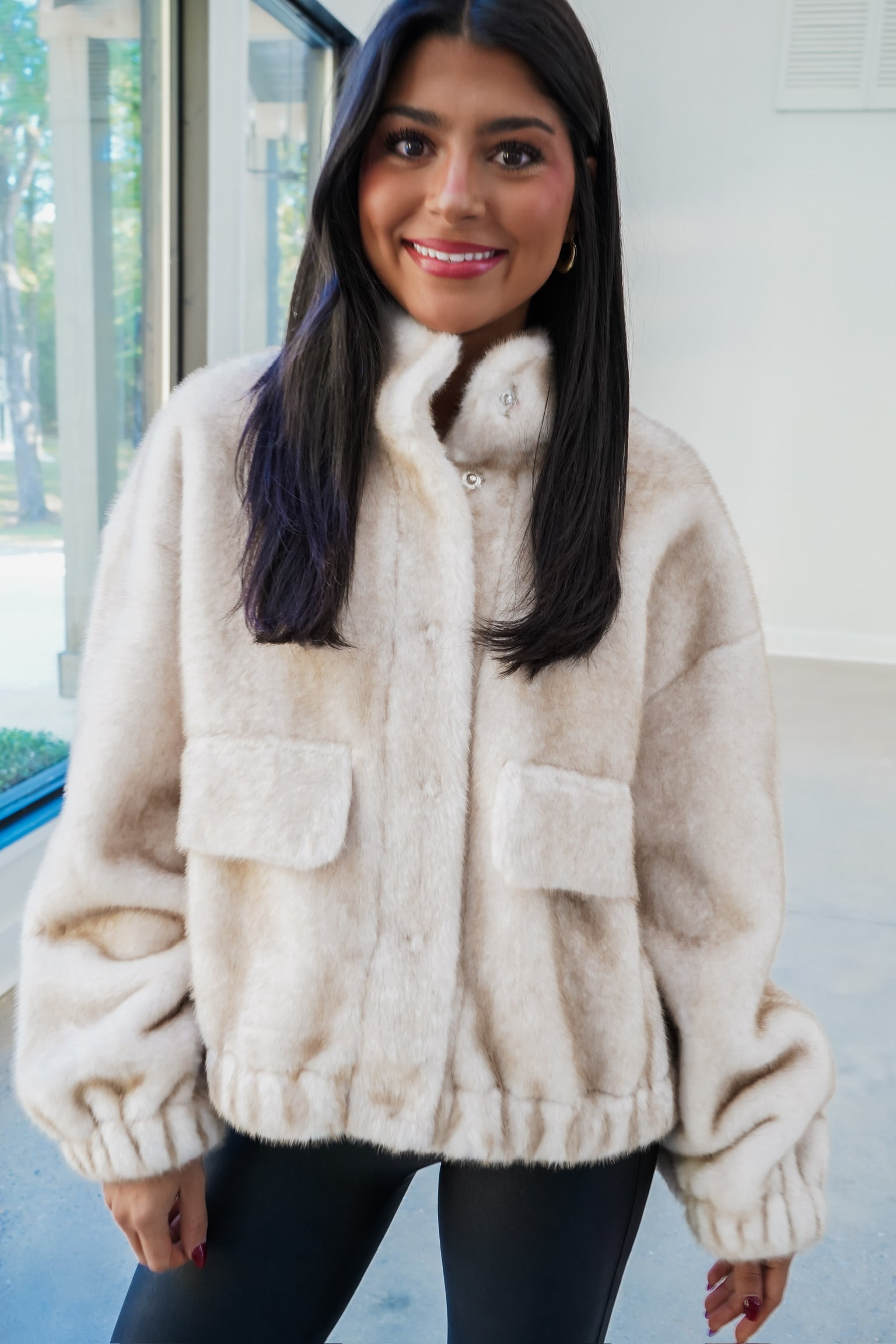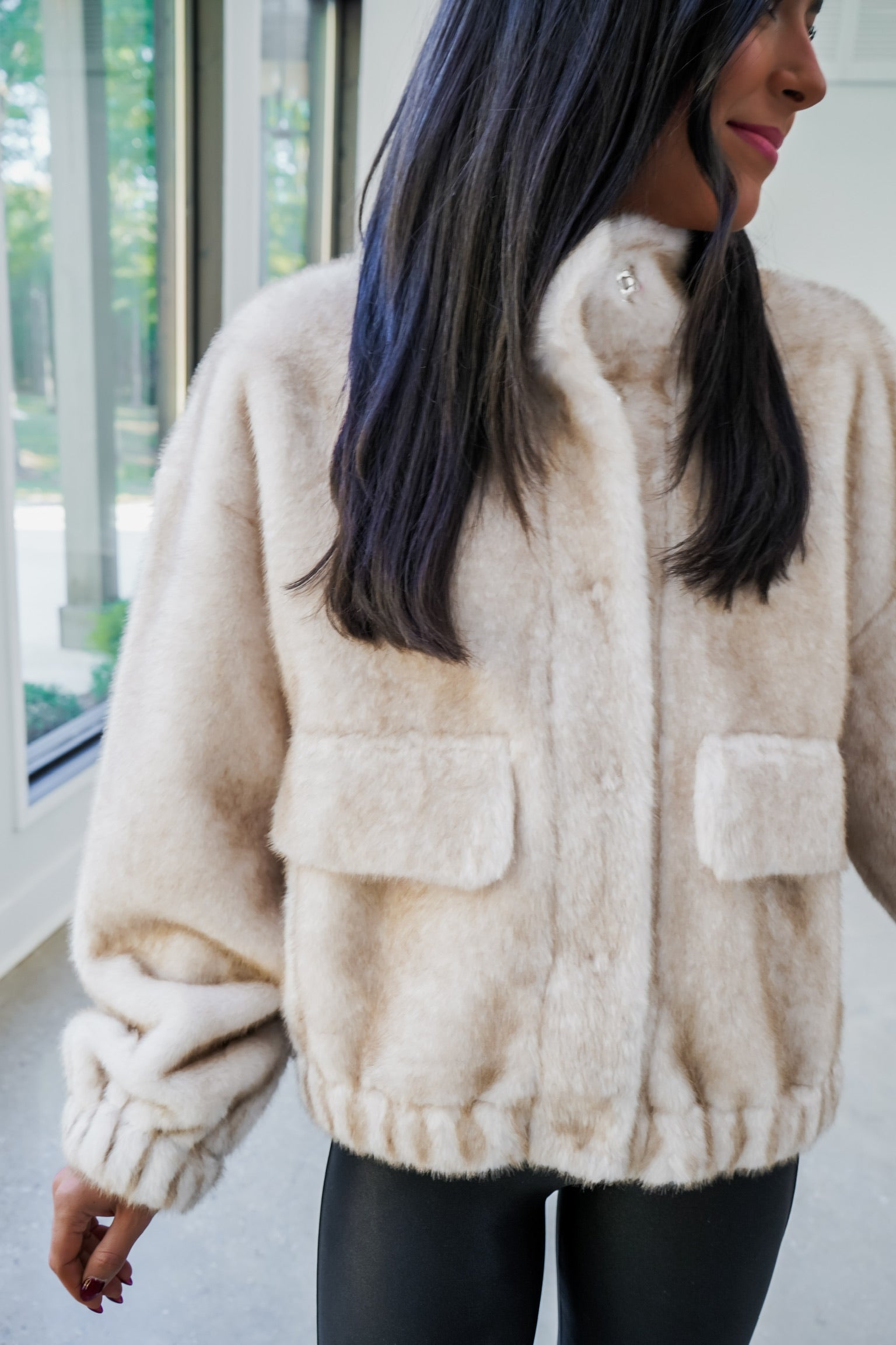 Stay chic and cozy this season with our creme faux fur bomber jacket, designed with a soft plush finish, elastic hem, and utility-inspired pockets. Perfect for layering, this versatile style brings modern comfort to your wardrobe while keeping you warm in cooler weather. A must-have for fall outerwear, faux fur jackets, and statement fall apparel, it’s ideal for both casual and dressy occasions.