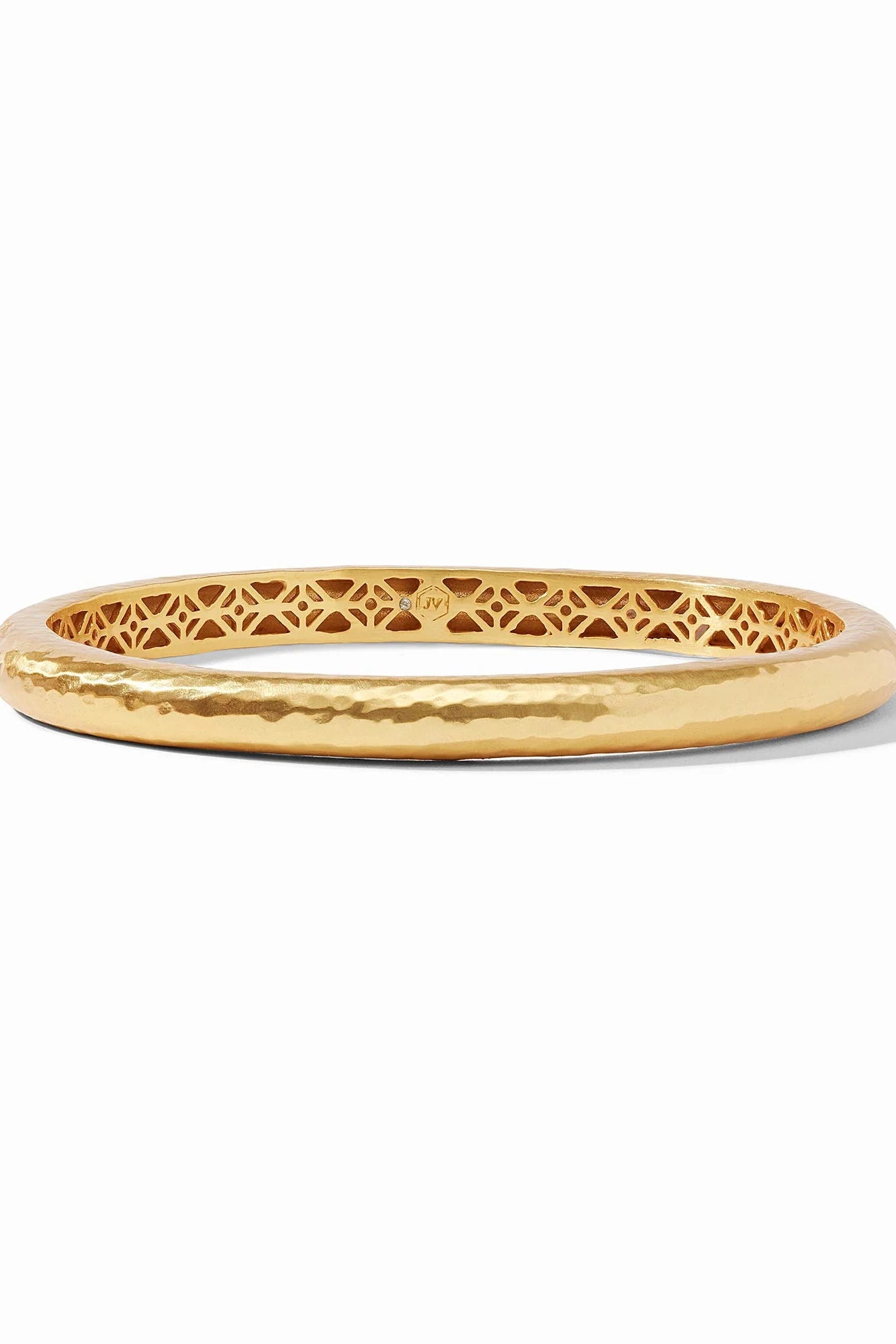 Elegant yet simple, this golden bangle features a lightly hand-hammered finish. An ornately geometric piercework interior adds lightness and luxury for wearing stacked or solo.