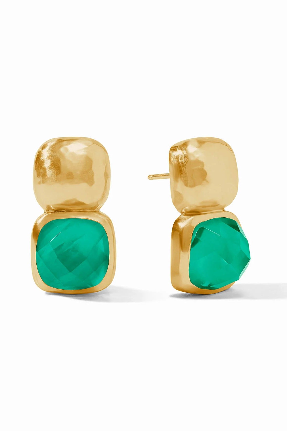 The stacked squares of these earrings—a lightly hammered top above the cushion shape gemstone underneath—comes in a spectrum of sparkling colors.