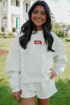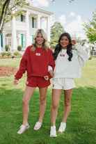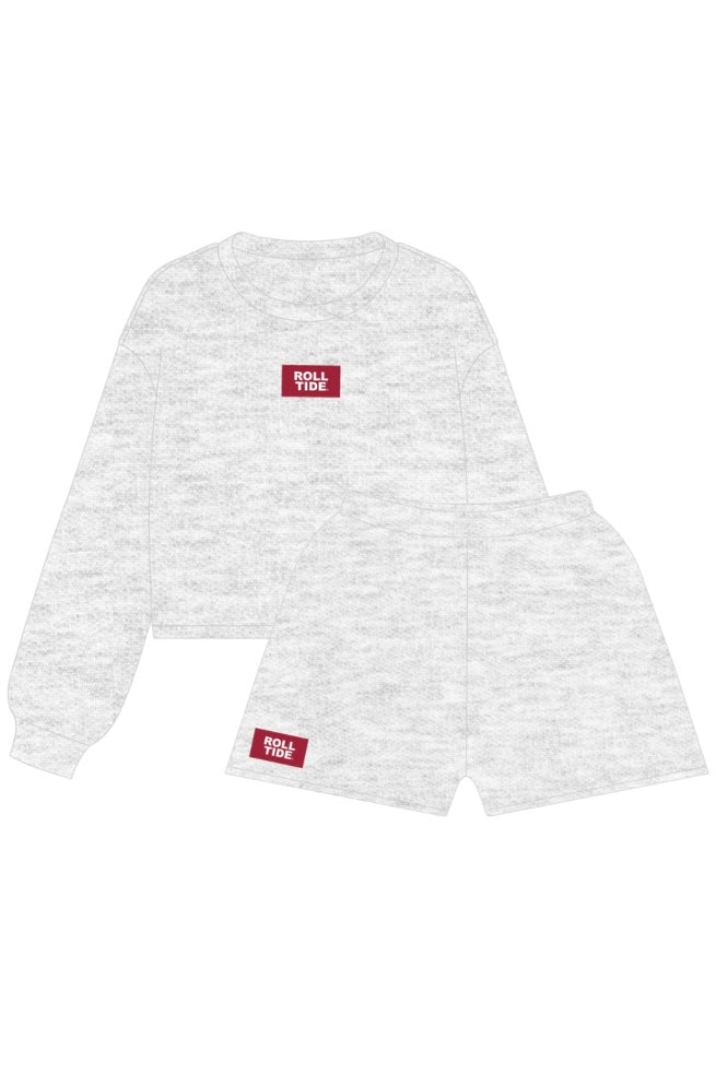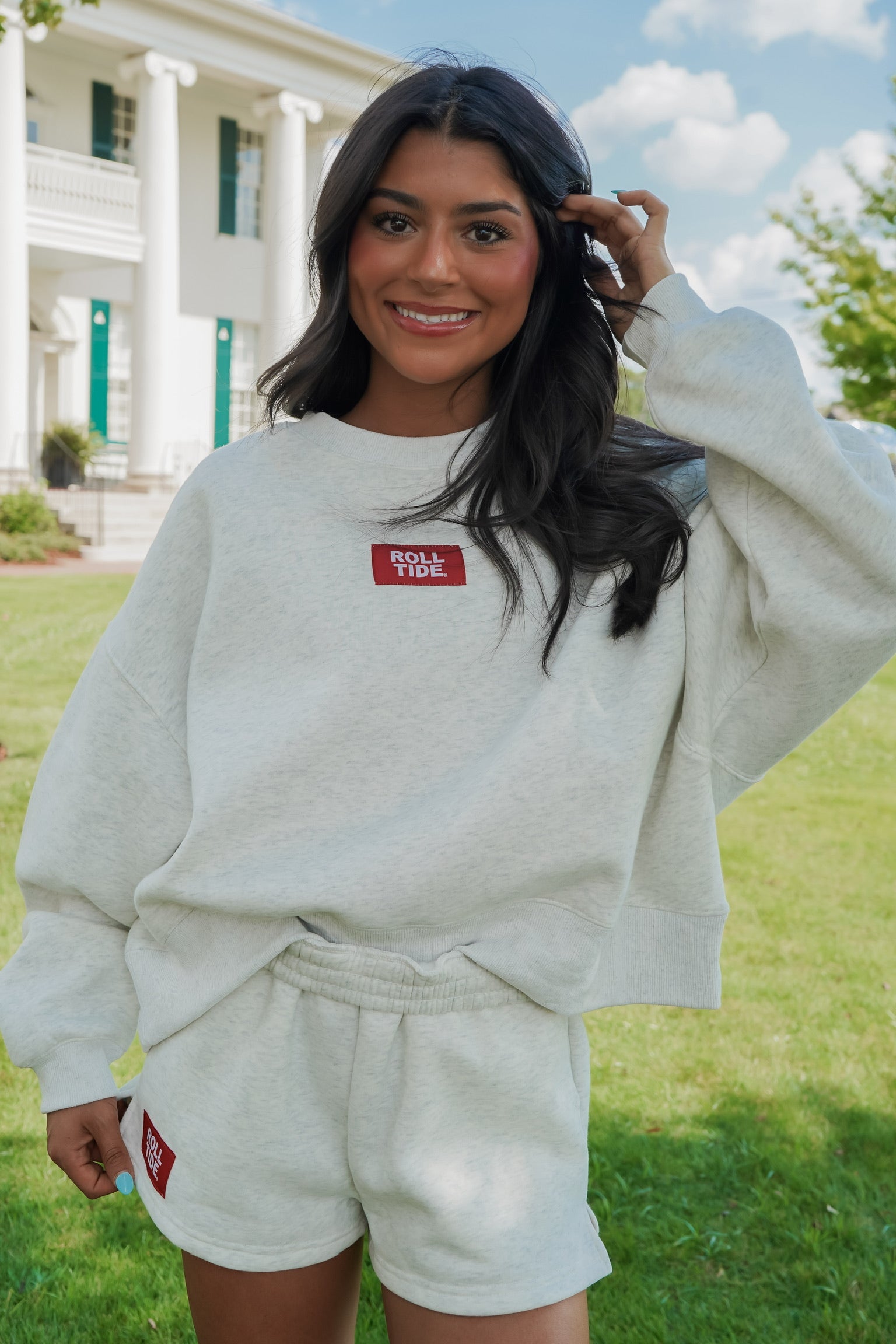 Get game day ready with this playful and comfy set! The slightly cropped crewneck sweatshirt pairs perfectly with wide elastic waistband shorts, both crafted from super soft, airy fabric that keeps you cool and light. Featuring a bold contrast patch with "ROLL TIDE," this true-to-size set is perfect for cheering in style and comfort.