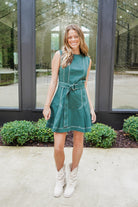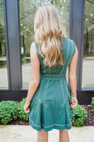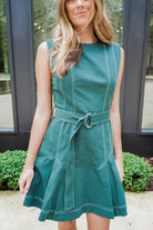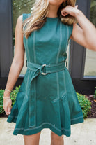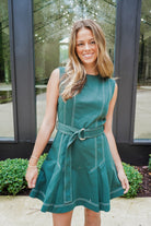 Turn heads in the Jillian Mini Dress! Featuring playful contrast top stitching and charming front pleats, this sleeveless dress brings flair to your look. The matching belted waistline accentuates your figure, while the polished tailored silhouette offers a sleek finish. With a back hidden closure, it’s as convenient as it is stylish—perfect for dancing the night away or stepping out with confidence.