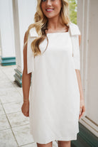 The Karsen Mini Dress combines timeless elegance with contemporary silhouette. Crafted in luxurious satin, this ivory piece features a flattering square neckline and distinctive wide bow shoulder straps that create a refined, statement-making detail. The streamlined mini shift cut offers effortless sophistication, making it equally suited for cocktail occasions or elevated casual wear. The fluid satin fabric drapes beautifully while maintaining structure, ensuring a polished appearance from day to evening.