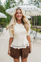 The Billie Top features playful short puff sleeves and a cozy ribbed texture. Its classic scoop neckline and delicate hand-sewn ruffle hem add a charming touch, making it perfect for both casual days and dressy nights.