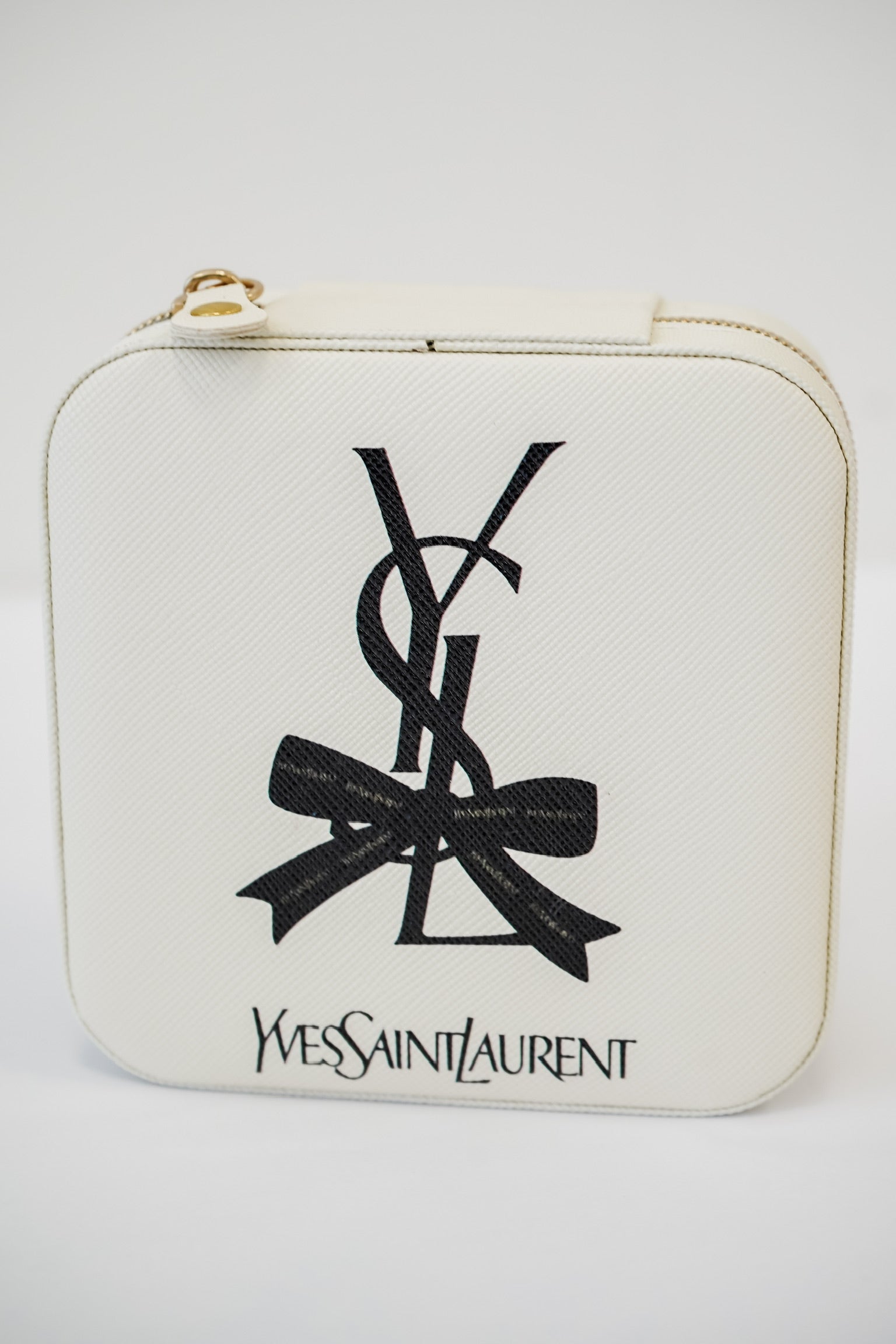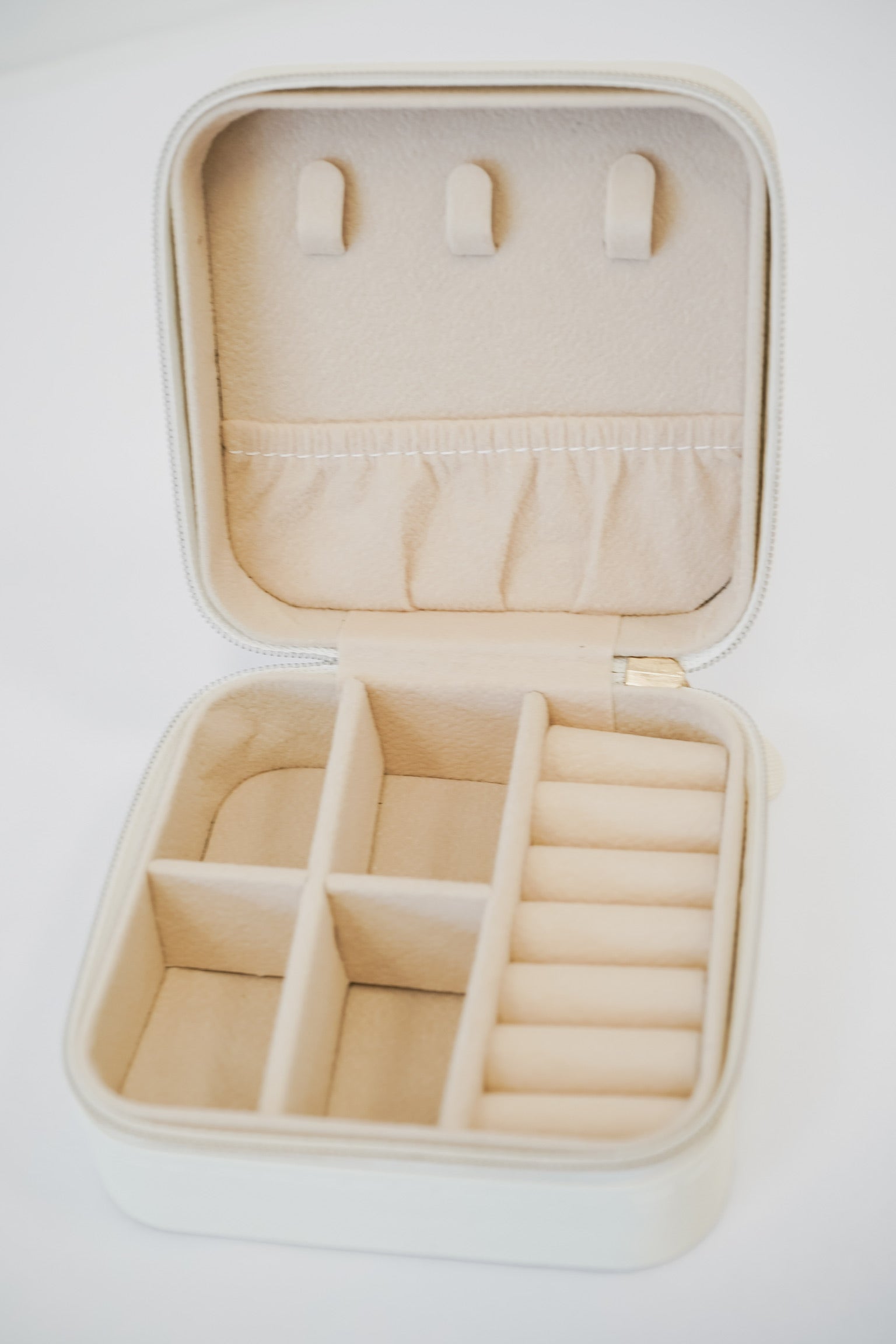 Keep your jewelry organized on your travels with this Travel Jewelry Case! The off white faux leather and gold zipper add style, while the cloth interior with compartments for necklaces, rings, and earrings provide practical storage. Plus, the printed design on the front adds a touch of personality to your travels. (4x4x2)