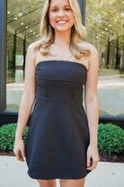Turn heads with the Aberdeen Mini Dress—a sleeveless, strapless delight designed to flatter with a tailored fit-and-flare silhouette. The playful back bow adds a flirty touch, perfect for making every occasion a little more fun and stylish.