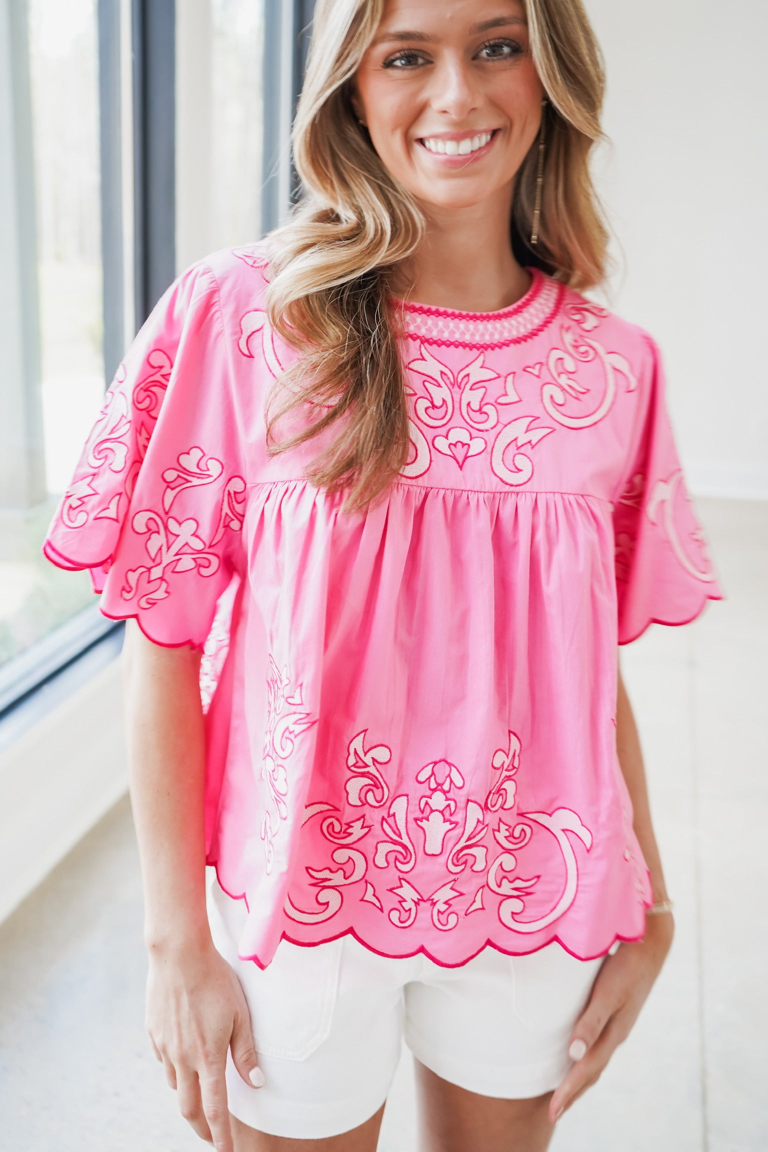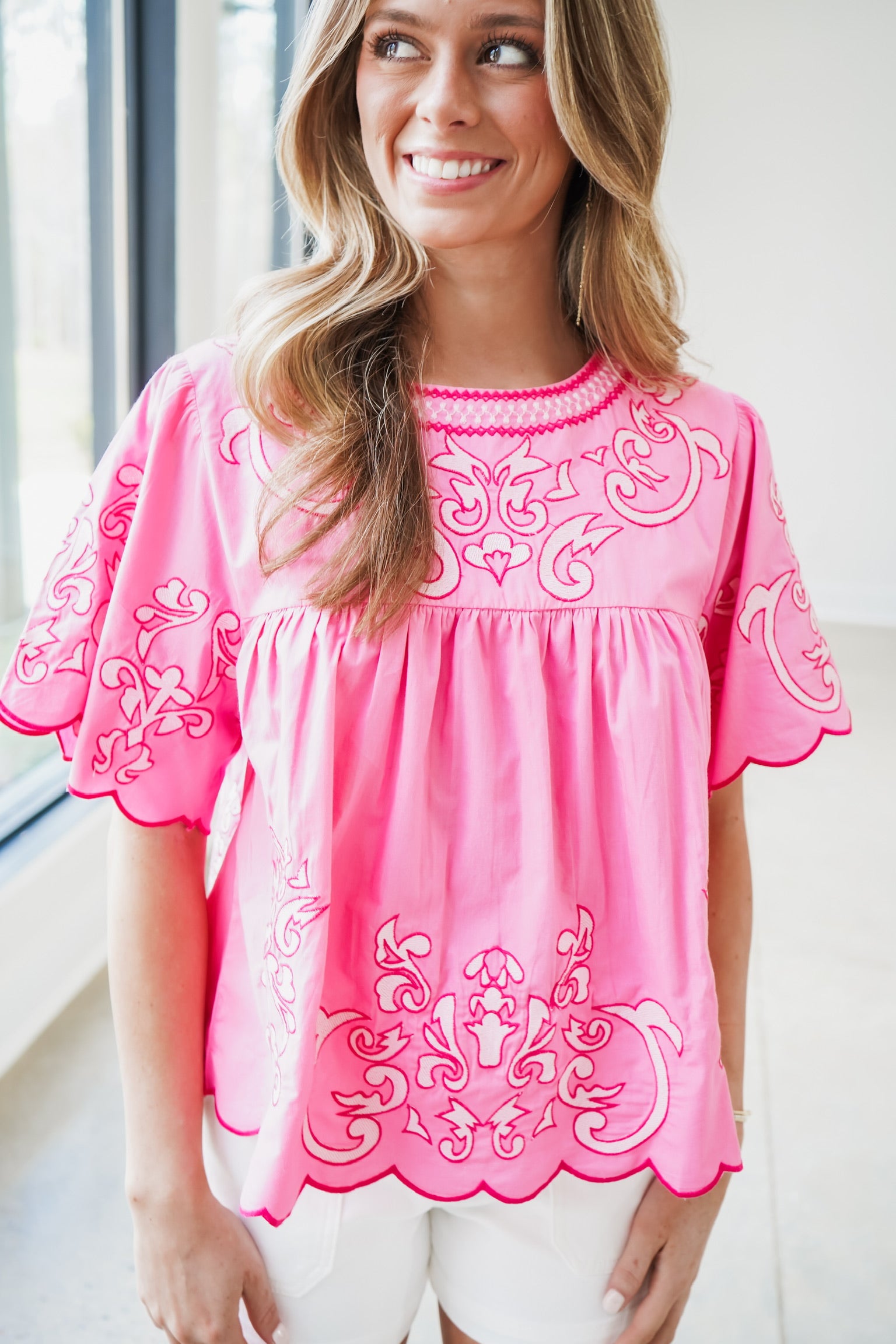Soft baby pink short sleeve top featuring a charming baby doll silhouette and scalloped hem details. The scoop neckline showcases delicate embroidered paisley motifs in contrasting light pink and red, adding an elegant touch to this versatile piece. Perfect for layering or wearing solo.