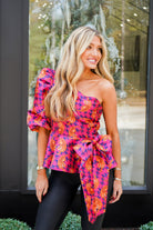 Who doesn't love a one shoulder moment?! The Amelia Top in Party Prowl offers it all - A puff sleeve one shoulder top with a tie waist and peplum body.