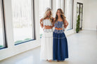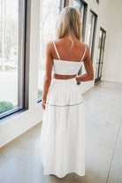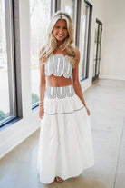 Elevate your wardrobe with the Bella Set in white. This chic two-piece ensemble features a scalloped crop top with delicate, adjustable shoulder straps for a customizable fit. The coordinating maxi skirt showcases striking navy blue top stitching that adds visual interest and dimension. Perfect for warm-weather styling, this set effortlessly transitions from casual daytime looks to evening occasions. The sleek silhouette and thoughtful design details make it a versatile staple for any season.