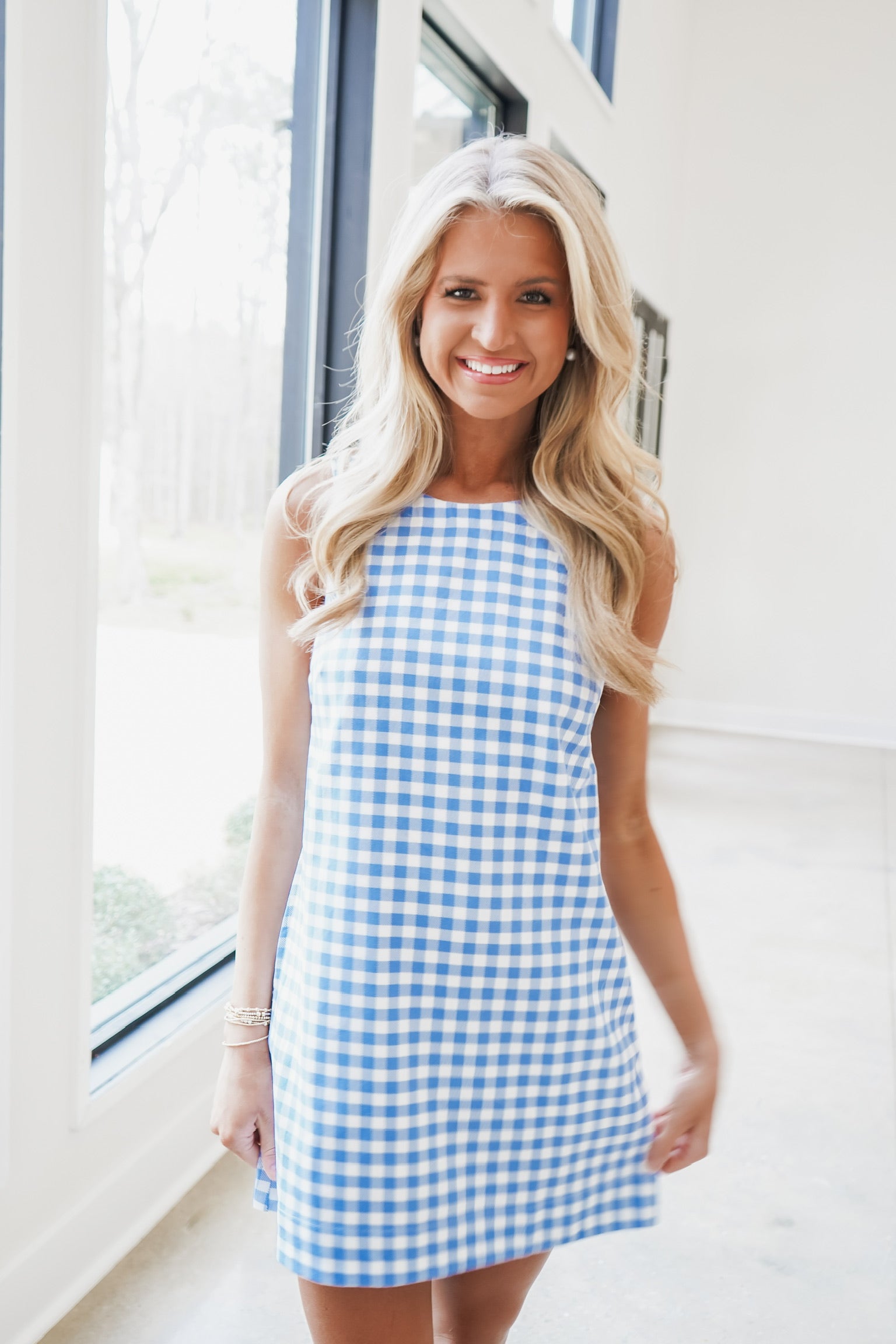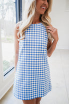 Effortless and charming, this blue and white gingham sleeveless shift mini dress is a wardrobe essential. The classic gingham pattern brings timeless appeal, while the relaxed shift silhouette offers comfortable, flattering wear. Perfect for warm weather styling, pair it with sandals for casual outings or dress it up with accessories for a polished look. The sleeveless design keeps you cool and breezy all season long.