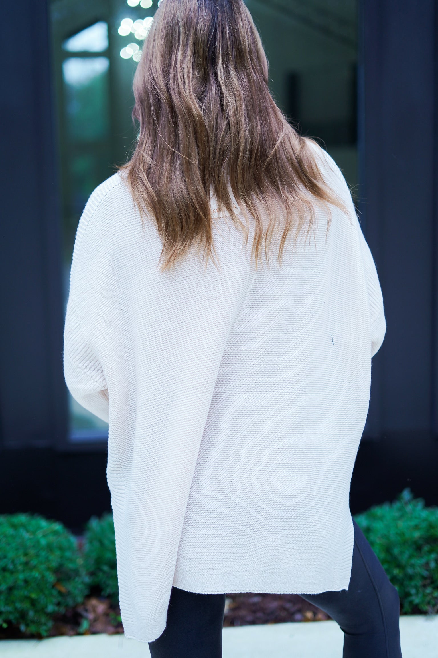 Turtleneck 3/4 sleeve tunic in garter stitch with side slits and contrasting rib accents