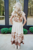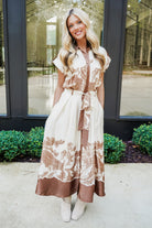 The Brie Maxi Dress blends elegance with playful details, crafted from smooth ivory satin accented by a bold brown print. Its sleeveless design and collared neckline create a chic silhouette, while the brown button placket adds a touch of contrast and charm. A belted waist tie defines your figure, complemented by convenient button closures at the shoulders for easy wear. Effortlessly graceful with a dash of fun, this dress is perfect for making a statement at any occasion.