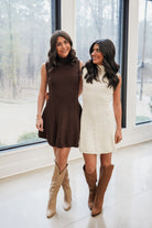 The Cailin Mini Dress is cozy elegance with a cheeky twist. This sleeveless stunner showcases a textured cable knit that adds depth and dimension, while the mock neck keeps things polished and put-together. The fitted bodice transitions into a flared skirt that moves with you, creating a silhouette that's both flattering and fun. Perfect for layering over your favorite long-sleeve tee or wearing solo when the weather cooperates—versatility never looked so good.