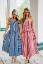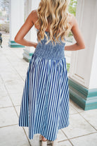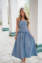 The Cally Midi Dress features a sophisticated navy and blue vertical pin stripe pattern in a timeless strapless, sleeveless silhouette. This tube-style midi dress offers a streamlined fit that flatters the figure, while the smocked back panel provides subtle texture and gentle shaping for comfort and movement. The combination of classic stripes and refined construction makes this piece versatile enough for both casual outings and elevated occasions. Perfect for those seeking understated elegance with modern appeal.