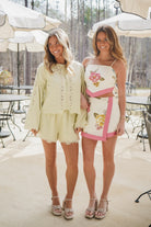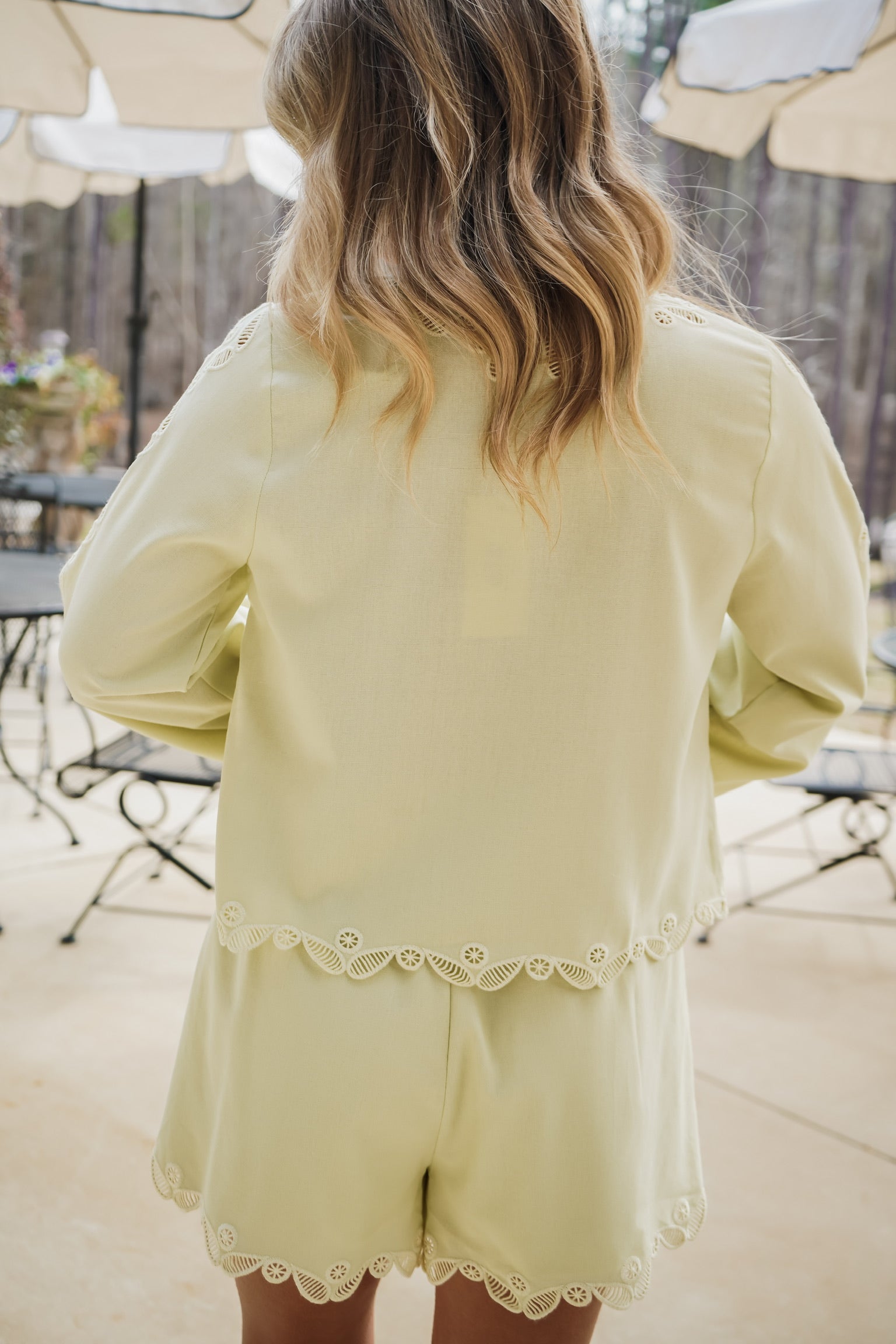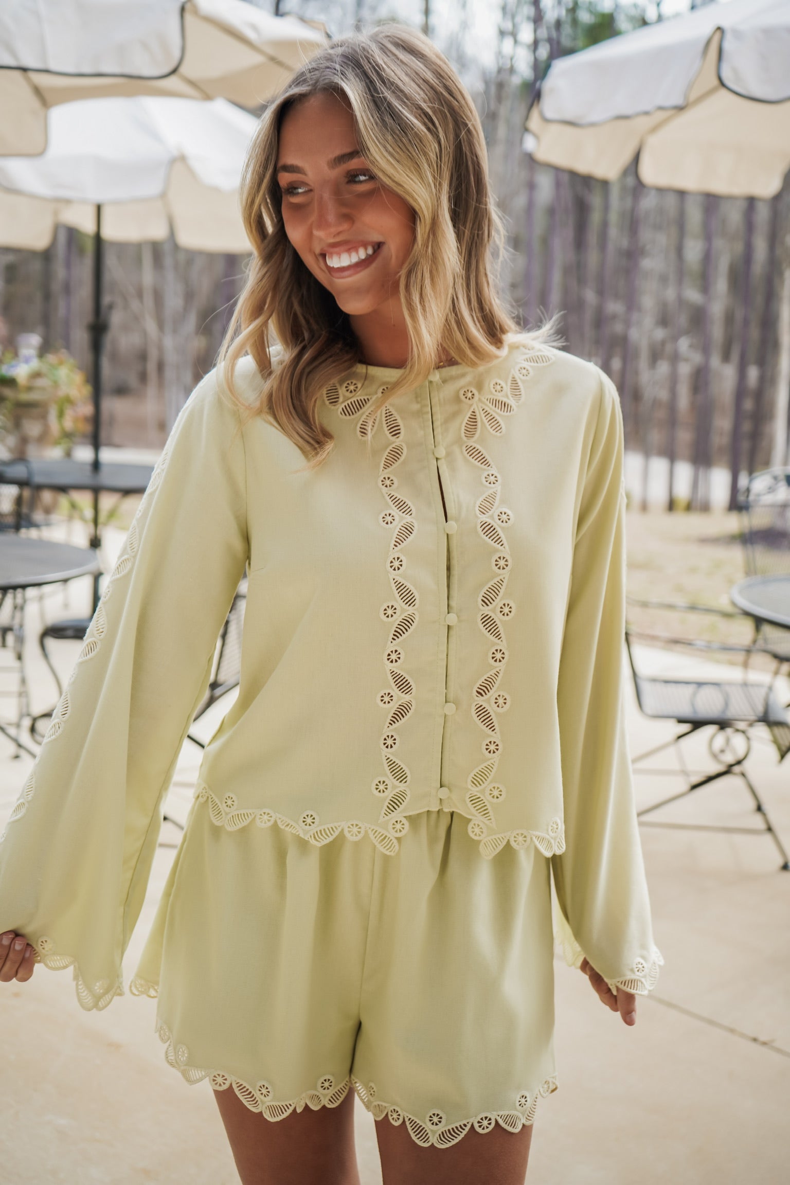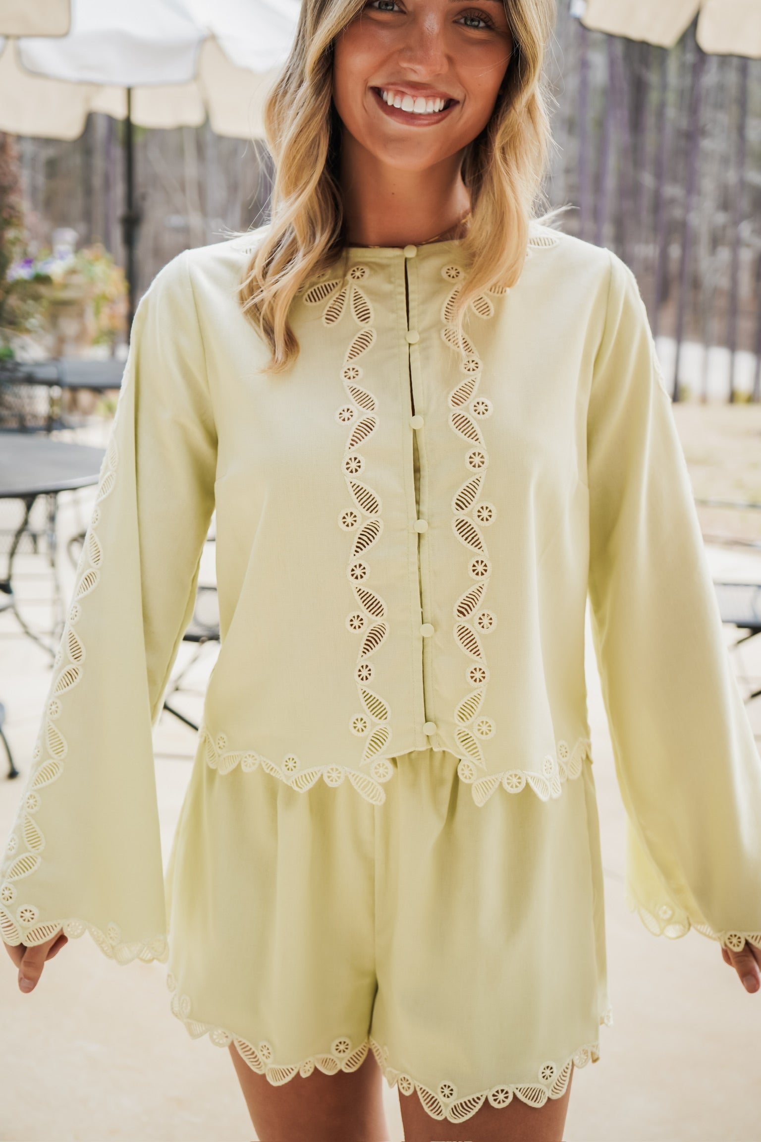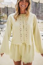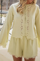The Camellia Set combines sophisticated style with refined details. This sage green two-piece ensemble features a button-down long sleeve top with gracefully flared sleeves and an intricate embroidered lace crochet cutout design that adds texture and visual interest. The front loop button closure ensures a polished fit, while the coordinating shorts complete the coordinated look. Perfect for elevated casual occasions or layered styling, this set delivers understated elegance with thoughtful craftsmanship.