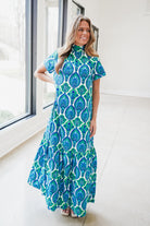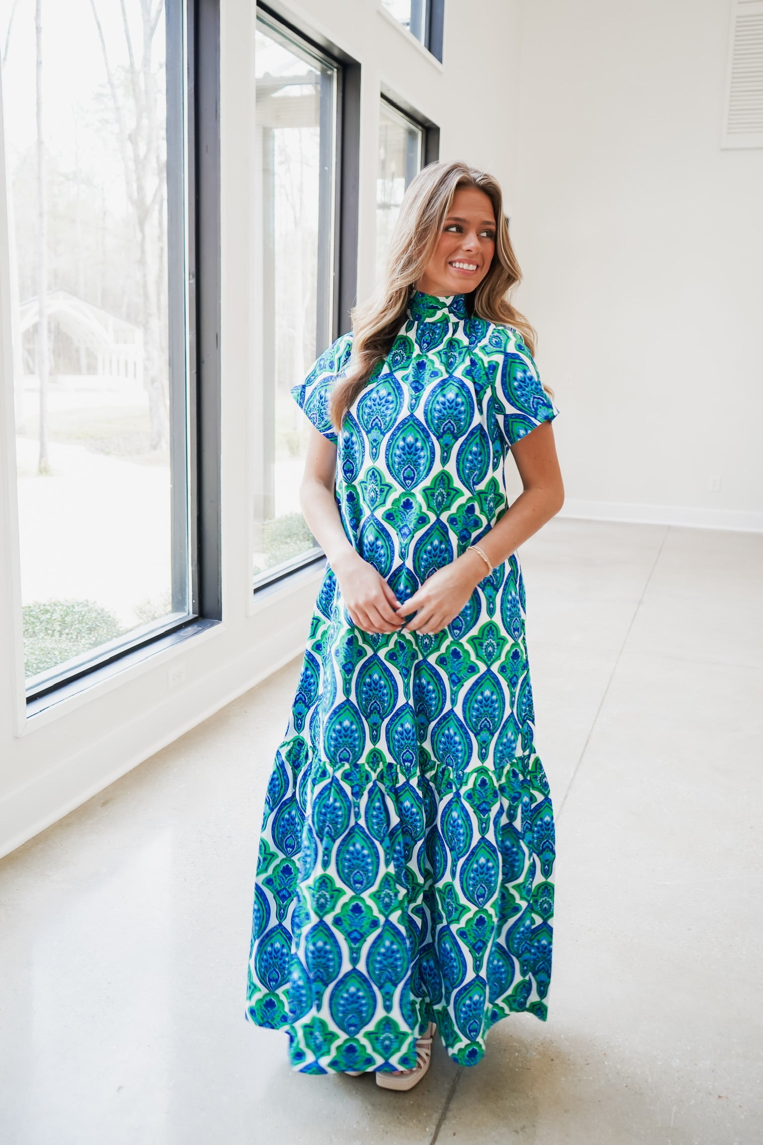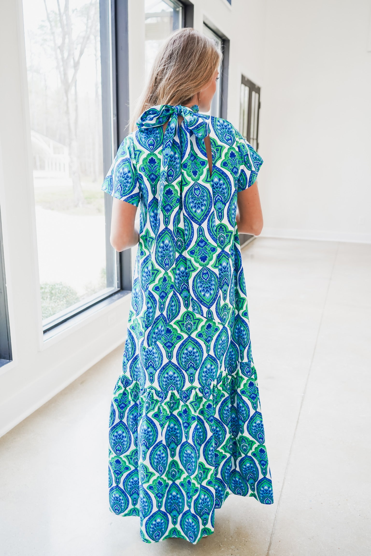 Elevate your wardrobe with the Esmery Maxi Dress, a striking piece that combines contemporary style with effortless elegance. Featuring a high mock neck and short sleeves, this oversized silhouette showcases an eye-catching abstract print in white, blue, and green tones. The standout detail—a dramatic bow at the back—adds movement and sophistication to this loose-fitting maxi. Perfect for making a statement at any occasion, this dress offers comfort without compromising on style.