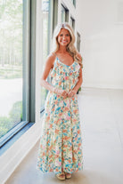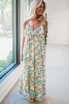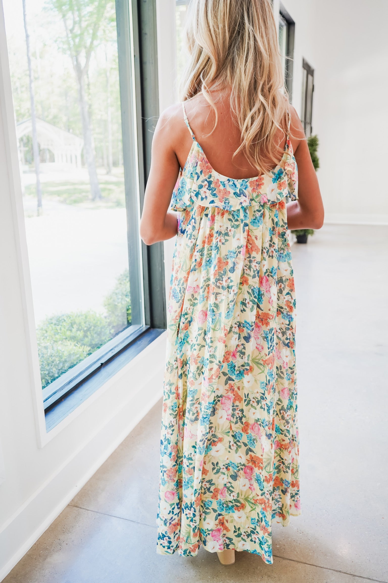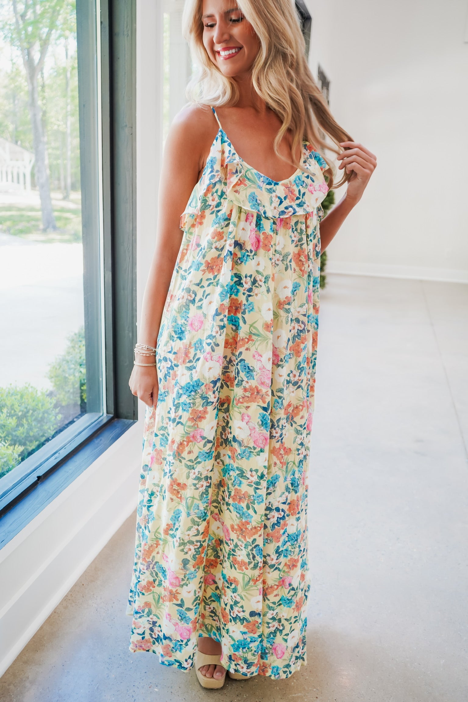 Effortless elegance meets playful charm in this Orion Maxi Dress. Featuring a butter yellow base adorned with delicate pink and blue florals, this sleeveless design showcases a romantic ruffle bodice and scoop back for added dimension. Adjustable thin straps ensure a custom fit, while the flowing maxi silhouette creates a graceful, flattering look perfect for warm-weather occasions.