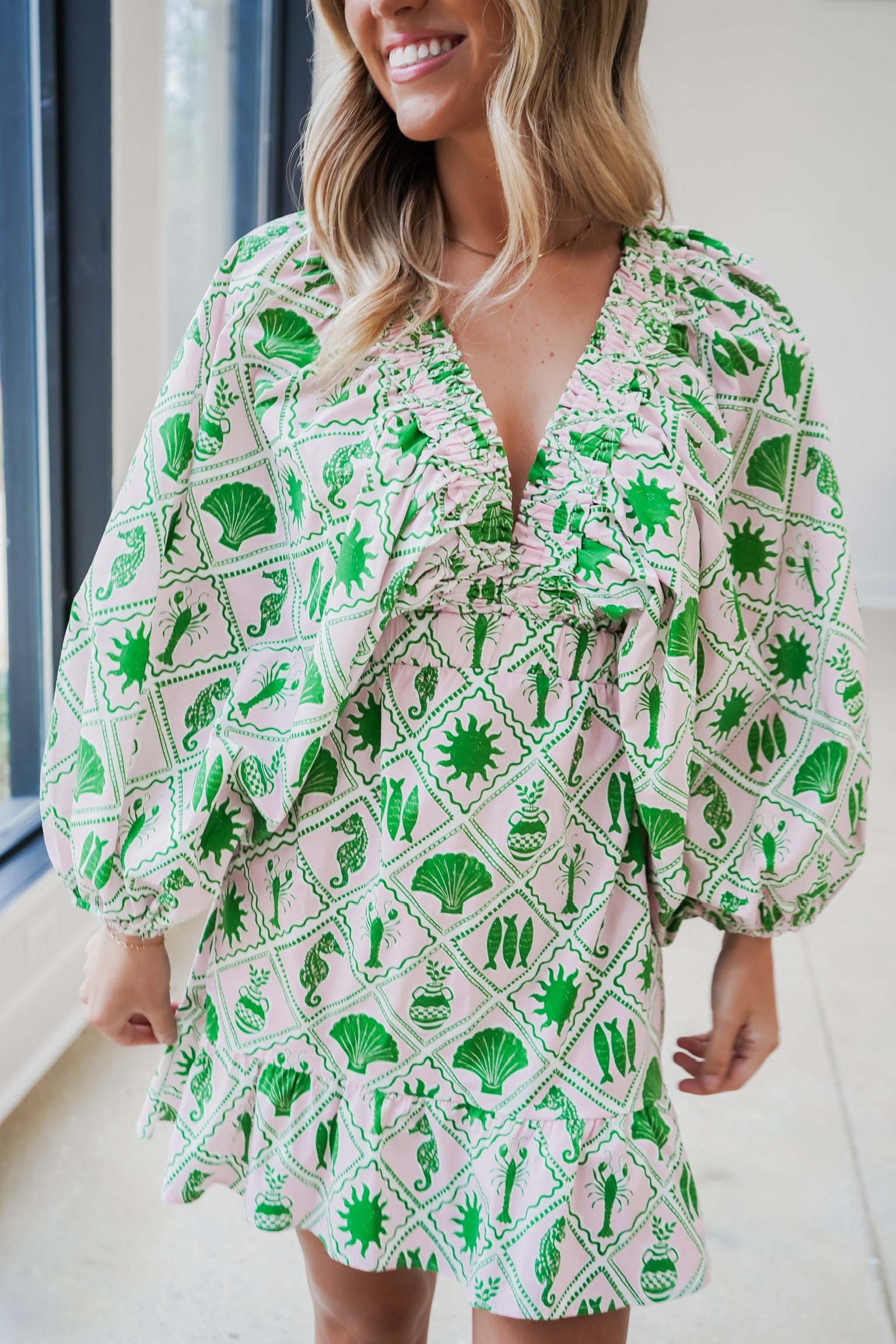 The Hadley Mini Dress features 3/4 puff sleeves, a flattering elastic waist, and our bold coastal collage print that seriously pops. From drinks with the girls to vacation days in the sun, it’s an easy look that always works!