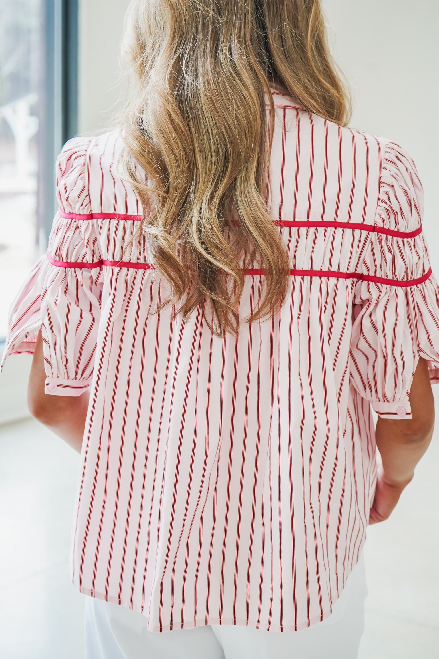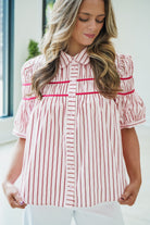 The Heath Top combines timeless sophistication with contemporary ease. This pink striped button-down features delicate puff sleeves that add dimension and charm, while the structured fit ensures a polished silhouette. The classic stripe pattern offers versatility—dress it up with tailored trousers or down with denim for effortless style. Premium construction and quality fabrics make this a wardrobe essential that transitions seamlessly from office to weekend wear.