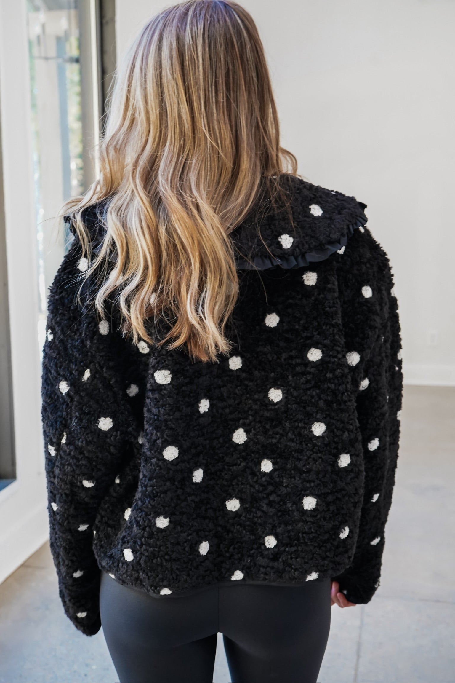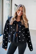 Experience the ultimate in cozy style with our Jeane Jacket! Made with soft sherpa material, this black and white polka dot jacket features a ruffle collared neckline and a triple bow tie front closure for a touch of elegance. Stay warm and make a statement with this versatile jacket!