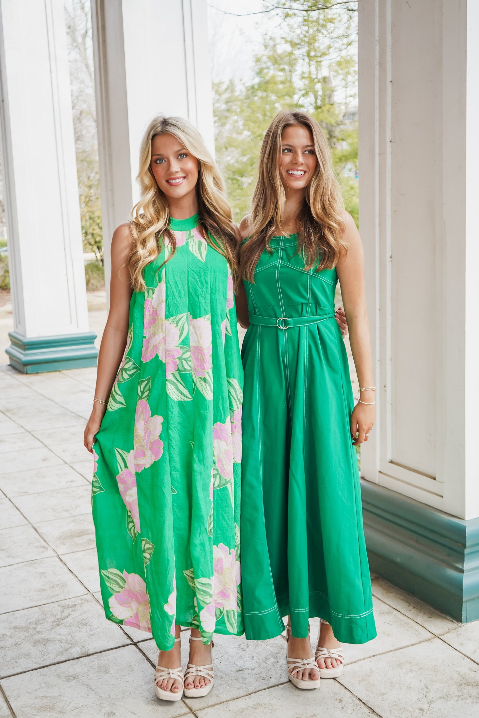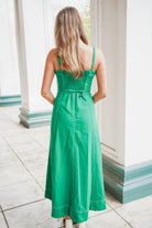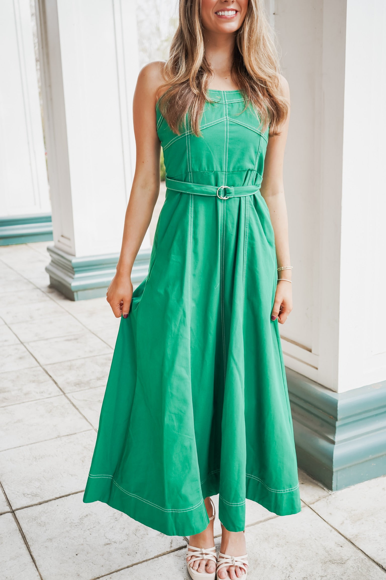 The Jillian Midi Dress combines refined elegance with thoughtful design details. This sleeveless style features adjustable shoulder straps that allow for a customized fit, while the belted waistline creates a flattering silhouette. The emerald green fabric is elevated by crisp white top-stitching throughout, adding visual interest and dimension. A distinctive square back with smocked detailing provides both comfort and an unexpected design element that sets this piece apart. Perfect for occasions requiring polished sophistication.