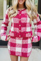 Get cozy and chic with the Karly Set, featuring a red and white plaid fuzzy sweater cardigan topped with shiny gold buttons. Paired perfectly with a matching mini skirt, this playful duo adds fun flair to your wardrobe while keeping you warm and stylish. Ideal for turning heads wherever you go!