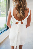 Effortless elegance meets modern design in the Kay Mini Dress. This off-white sleeveless style features a classic boat neck and open back with delicate criss-cross straps for a touch of intrigue. The stretch linen fabric moves with you while maintaining its refined look, while the knotted waistband adds definition and visual interest. Perfect for warm-weather occasions, from casual brunches to evening gatherings.