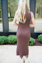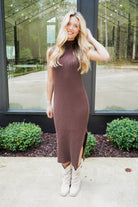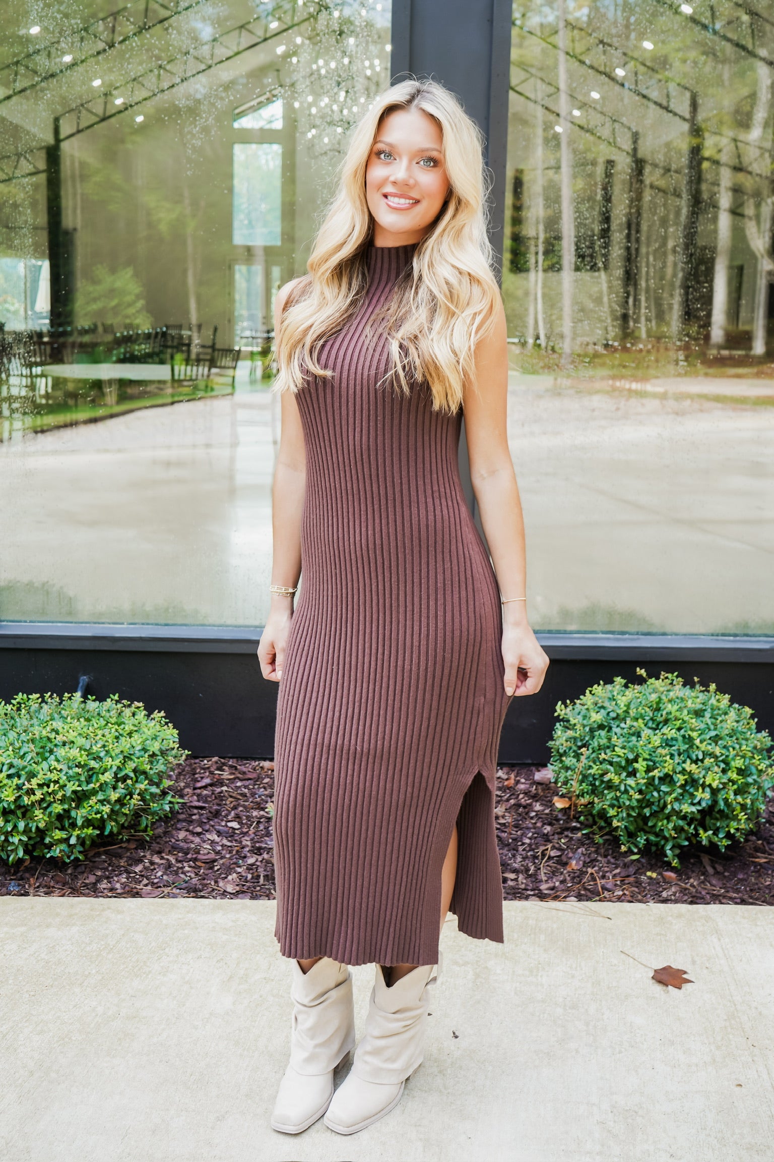 This sleek ribbed midi dress hugs your curves with a fitted silhouette that's both chic and comfortable. The sleeveless design and high mock neck add a touch of elegance, while the side leg slit lets you move with flair. Perfect for turning heads day or night!