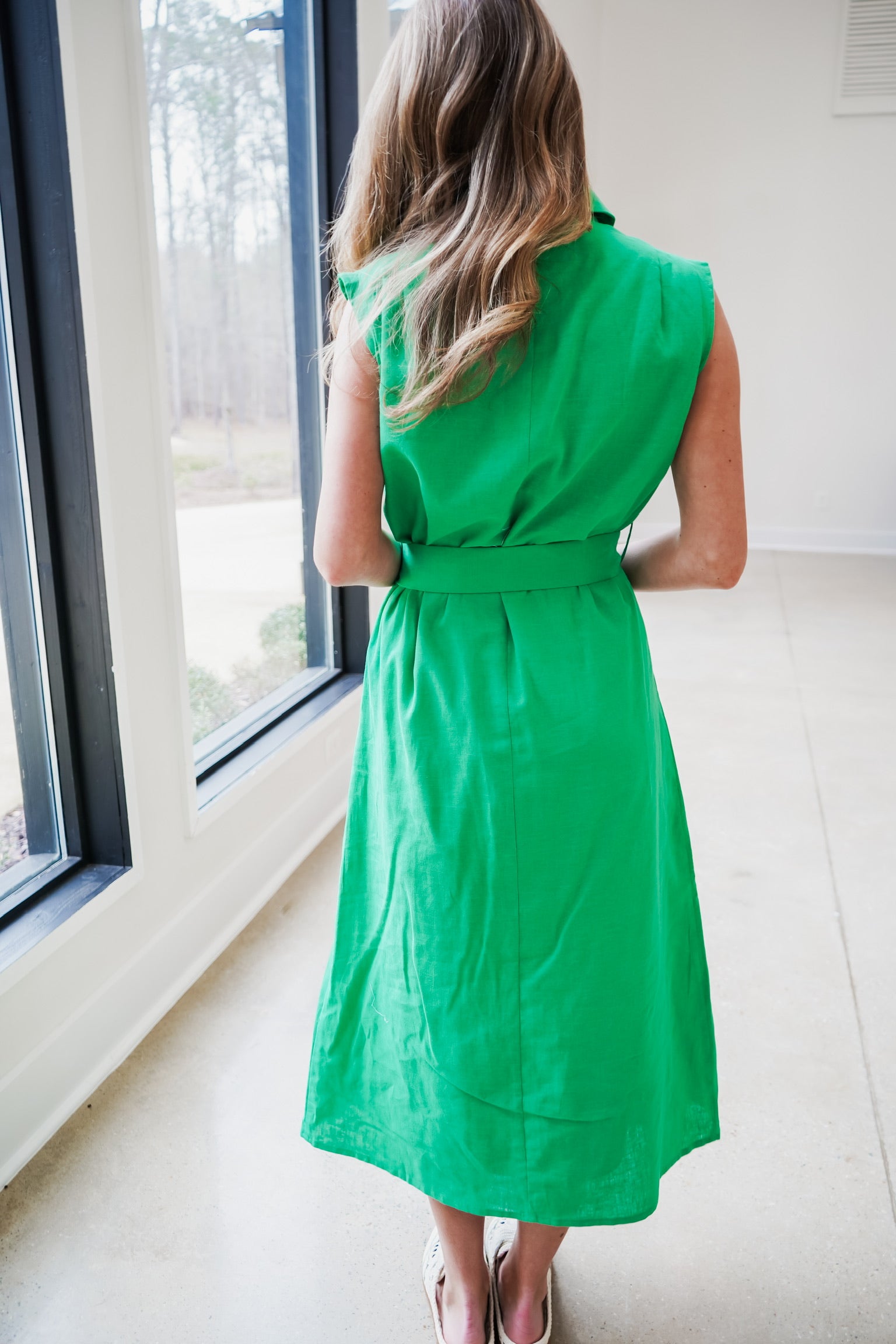 Crafted from breathable linen, this sleeveless maxi dress combines timeless elegance with practical functionality. The collared neckline and full front button closure offer refined structure, while the belted sash bow at the waist creates a flattering silhouette. Functional side pockets add everyday convenience. Perfect for warm-weather occasions, from casual outings to elevated gatherings, this versatile piece transitions effortlessly from day to evening.