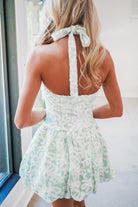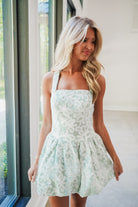 Elevate your wardrobe with the Luverne Mini Dress in a sophisticated green pinstripe. This sleeveless design features a structured square bodice with a flattering halter neckline, complemented by an elegant back bow detail. The bubble hem skirt adds playful movement, while delicate white contrast embroidered eyelet accents bring timeless charm. Perfect for brunch, date night, or any occasion calling for polished style.