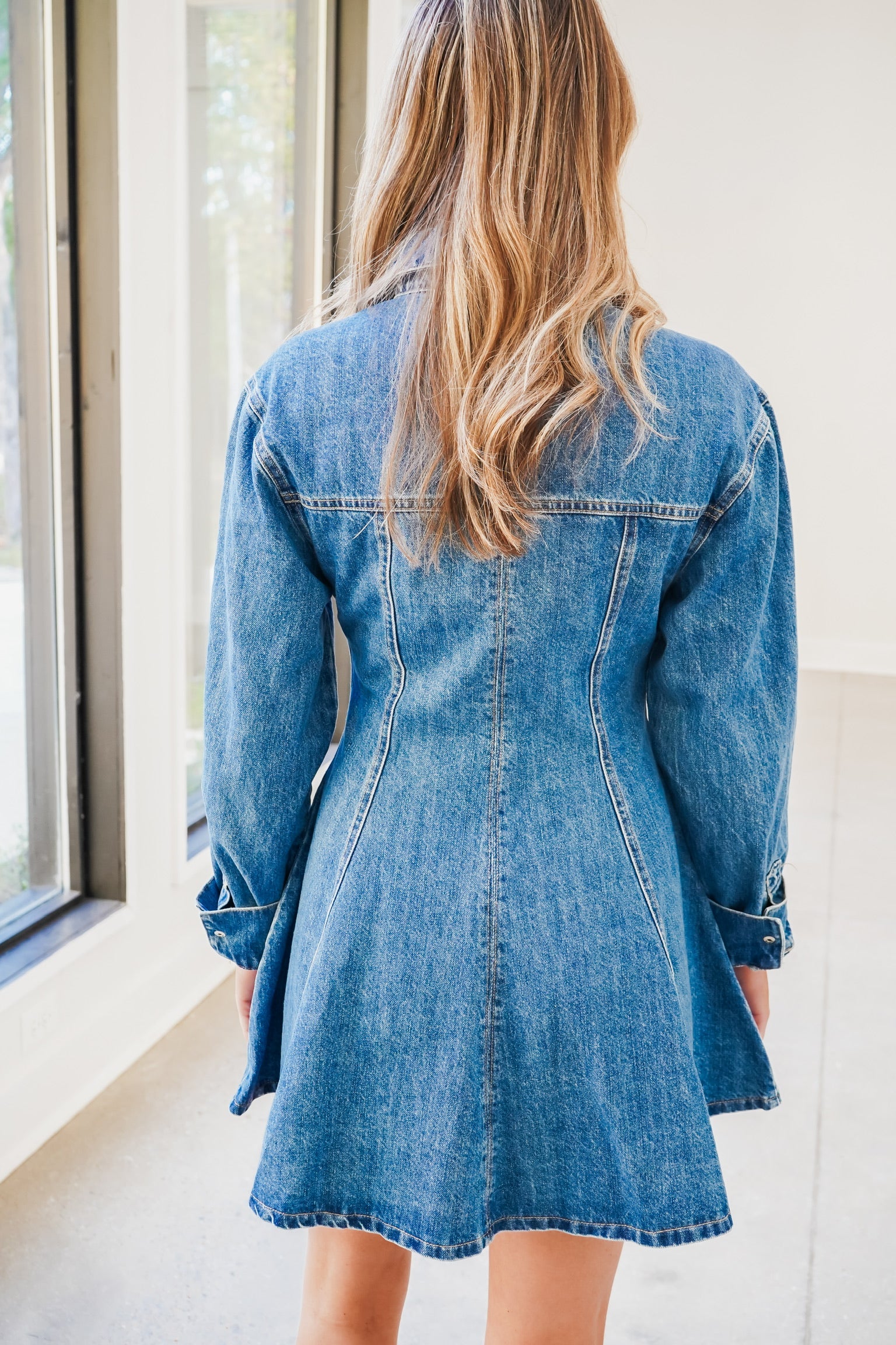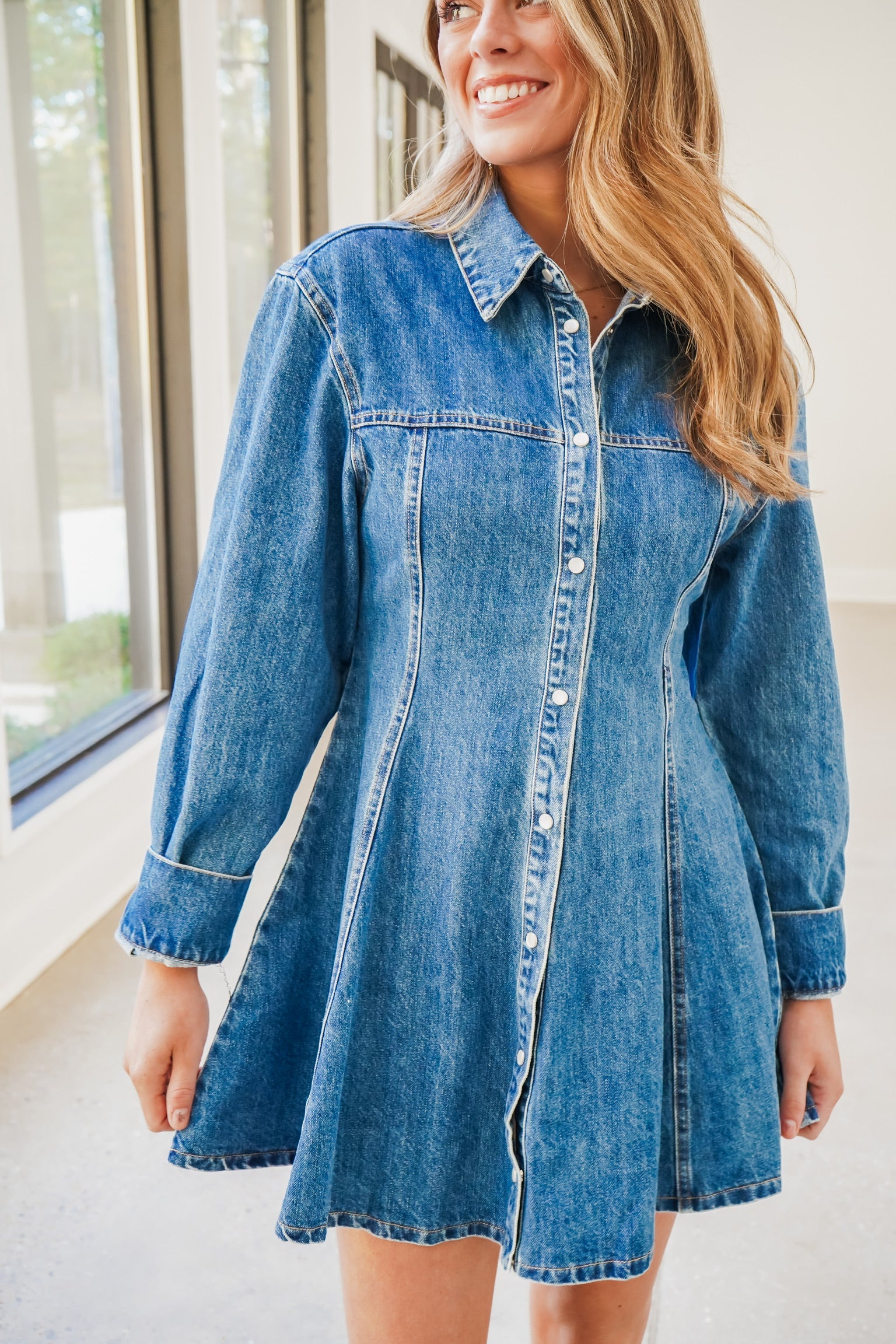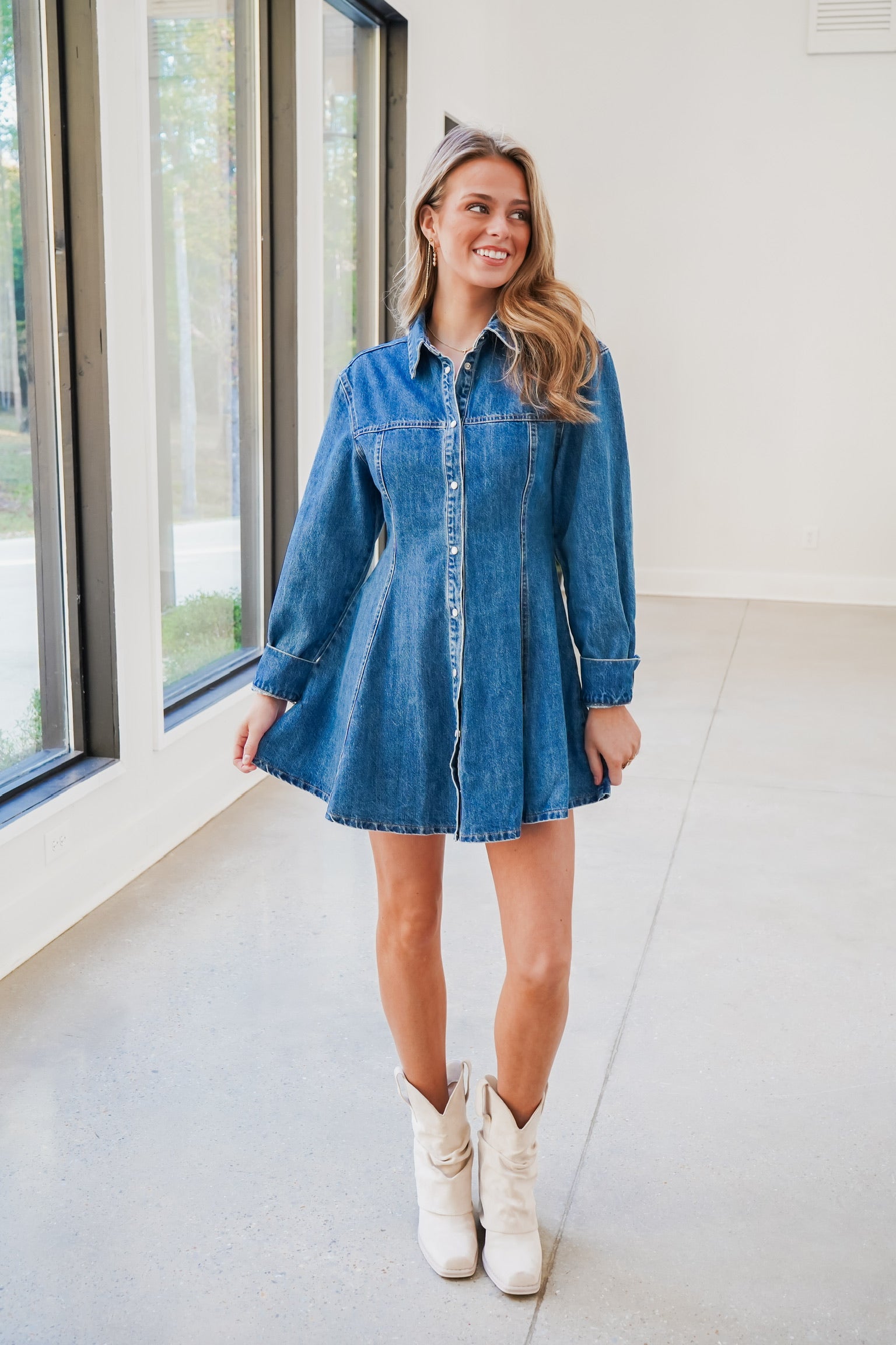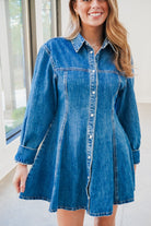 The Nader Mini Dress is your playful go-to with its classic denim vibe. Featuring a collared neckline, silver snap buttons down the front, and cuffed long sleeves, this button-down mini mixes casual cool with a flirty edge. Effortlessly stylish for day or night adventures!