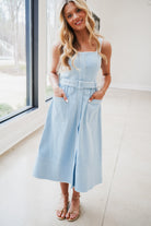 The Nita Midi Dress combines timeless elegance with contemporary design. This light baby blue midi features a flattering square neckline and sleeveless silhouette, perfect for warm-weather occasions. The belted waist creates definition and a refined silhouette, while delicate white contrast embroidered trim adds sophisticated detailing. Versatile enough for brunch, garden parties, or casual evening wear, this piece transitions seamlessly from day to night with minimal accessorizing.