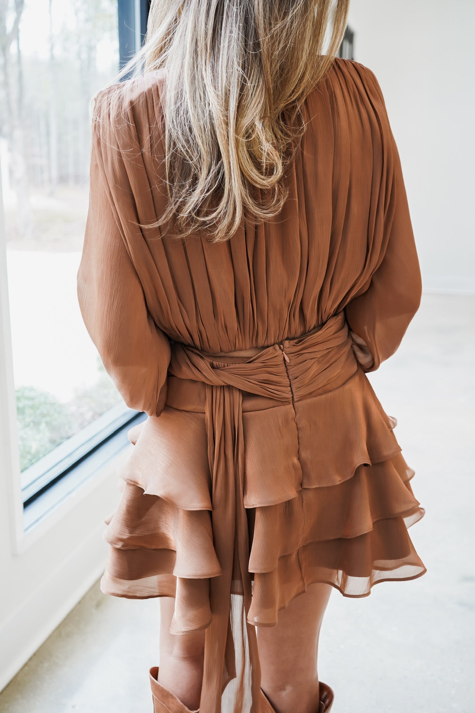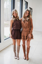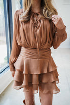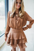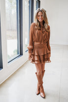 Elevate your ensemble with the Patton Set—a show-stopping two-piece that's equal parts chic and fun. The long-sleeve crop top features a flattering keyhole bodice and tie-string closure, crafted from luxurious brown satin shimmer organza with pleated, textured detailing that catches the light beautifully. Pair it with the matching tiered ruffle skirt, complete with a waistband sash for that extra touch of drama. Perfect for date night, celebrations, or whenever you're ready to turn heads in style.