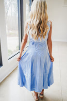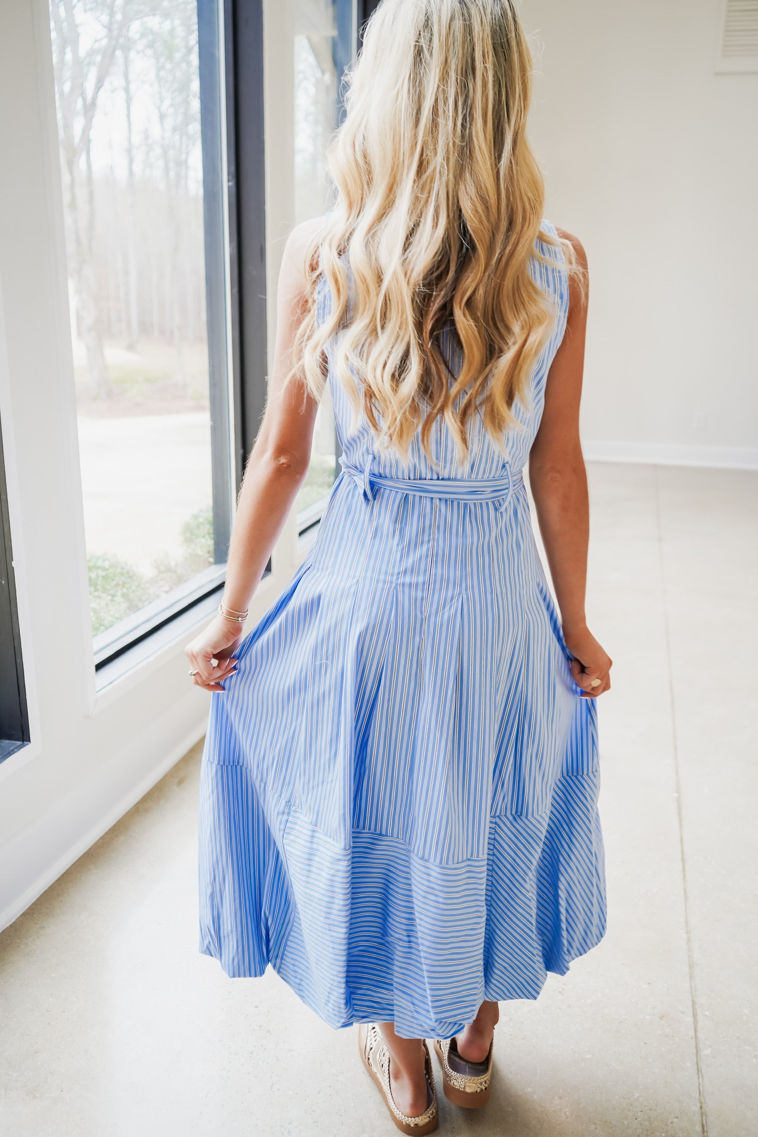 This sophisticated maxi dress combines timeless vertical striping in blue, black, and white with contemporary design details. The sleeveless silhouette features a flattering scoop neckline and a defined belted waistline that creates an elegant hourglass shape. The poplin fabric provides structure and movement, while the distinctive bubble hem adds visual interest and dimension to the hemline. A discreet back zipper ensures a seamless fit. Perfect for elevated casual occasions or refined evening wear, this versatile piece transitions effortlessly from season to season.