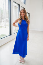 Elevate your wardrobe with the Saisha Midi Dress, a sophisticated cobalt blue piece designed for effortless elegance. This sleeveless midi silhouette flatters every frame, while the distinctive back keyhole detail adds an unexpected touch of allure. Perfect for cocktail events, dinner dates, or elevated casual occasions, this dress transitions seamlessly from day to night. The rich cobalt hue complements all skin tones and pairs beautifully with statement jewelry or minimalist accessories. A timeless investment piece that delivers both style and versatility.