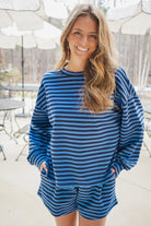 Effortless comfort meets playful style with the Shelly Set! This oversized long sleeve tee features a striking horizontal color block stripe design in vibrant cobalt blue and soft navy blue, paired with matching comfy elastic waist bottoms for a coordinated look. Perfect for lounging, running errands, or casual hangouts—slip it on and feel the ease of relaxed-fit fashion that doesn't compromise on personality.