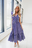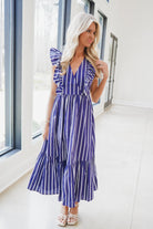 Elevate your wardrobe with the Verta Midi Dress, featuring a chic navy and white vertical stripe pattern. The flattering surplice bodice and v-neckline create a refined silhouette, while flutter cap sleeves add a touch of feminine elegance. A tiered ruffle skirt provides movement and dimension, making this versatile piece perfect for both casual outings and dressed-up occasions. Comfortable, stylish, and effortlessly put-together.