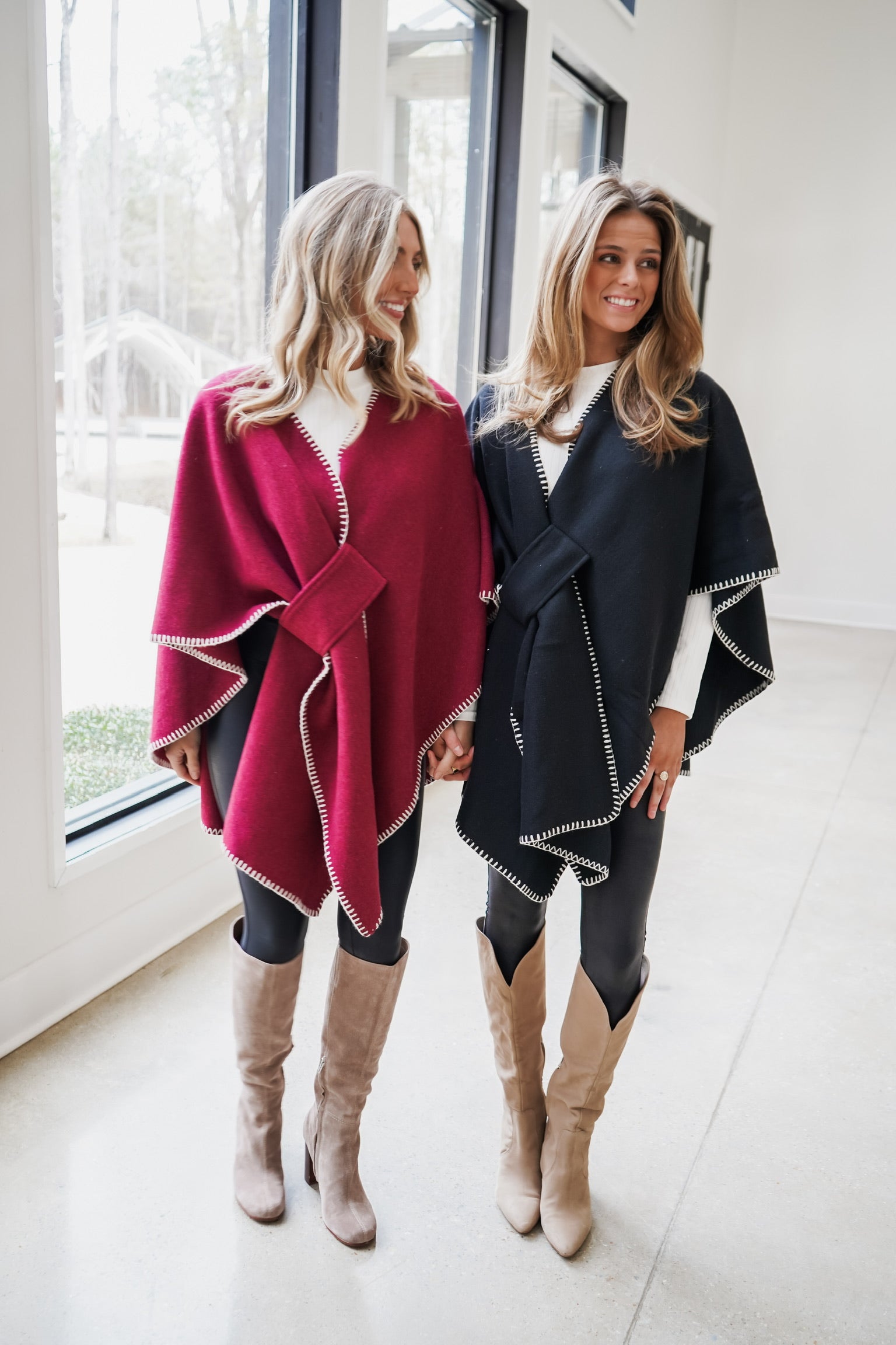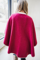 The Whip Stitch Wrap by Dolce Cabo blends timeless elegance with modern ease. Its flowing poncho silhouette is trimmed with striking crème whipstitch edges, creating a refined contrast against the sleek black body. Designed with a belted front for shape and versatility, it layers beautifully over everything from lightweight knits to crisp blouses. Perfect for crisp autumn days, this piece offers both warmth and sophistication, making it a go-to wrap for polished, cozy-chic style all season long.