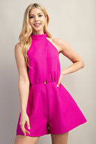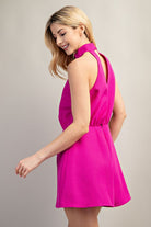 The Lala Romper in vibrant magenta features a playful sleeveless, strapless halter neckline that highlights your shoulders. Its wrap-style bodice adds a flattering touch, while a large keyhole detail at the back keeps things flirty and fun. Perfect for making a bold statement with effortless charm.