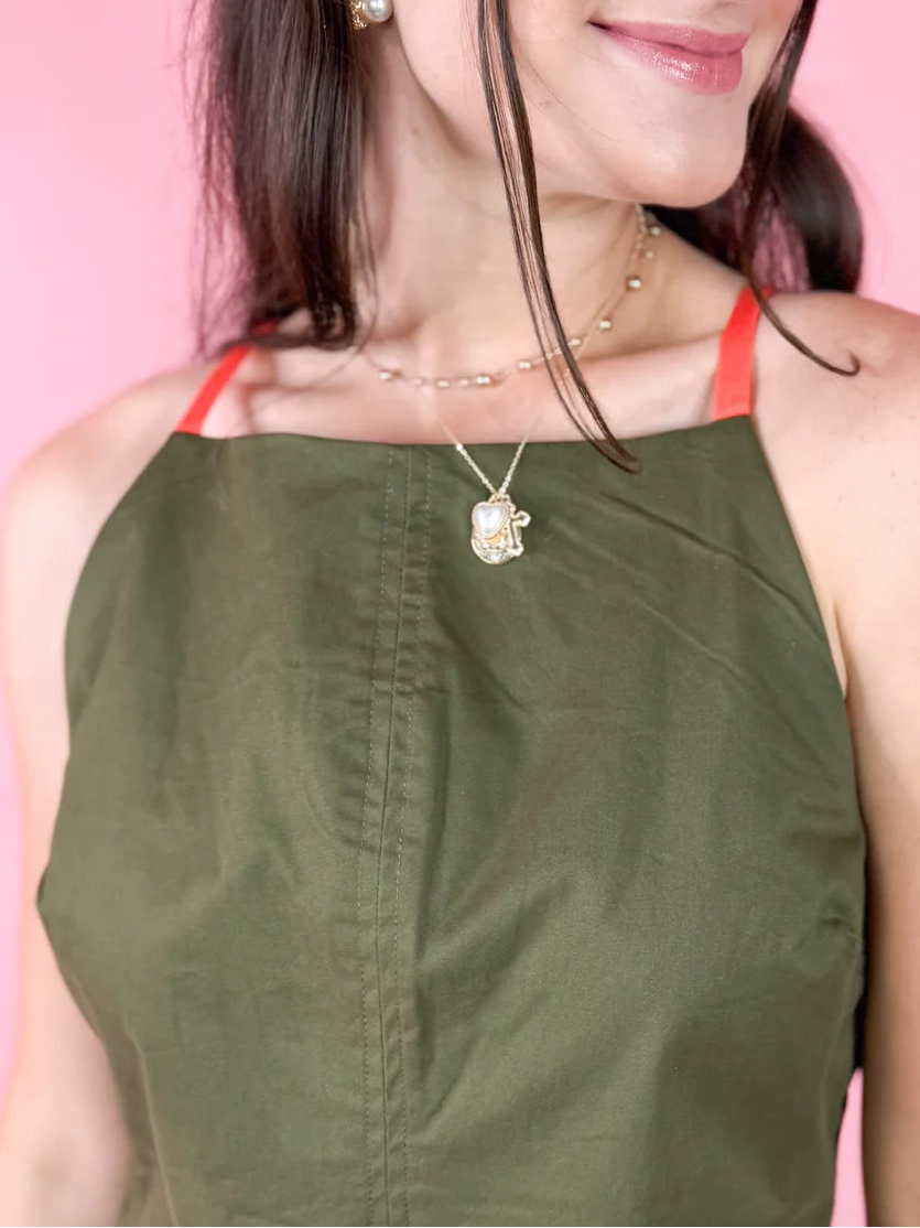 Effortlessly stylish and ready for anything, the Amos Dress brings together rich olive tones with vibrant orange strap accents that demand attention. This sleeveless design transitions seamlessly from casual brunch dates to weekend getaways, layering beautifully over tees or standing solo for warmer days. The playful color combo makes it a versatile closet essential that works as hard as you do—dress it up with heels or keep it relaxed with sneakers.