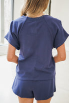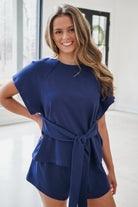 Elevate your casual wardrobe with this sophisticated two-piece set. The navy blue short-sleeved top features a refined bow waist tie belt that cinches for a flattering silhouette, while the coordinating sweatshirt offers comfort with its soft fabric, elastic waistband, and drawstring closure. Perfect for effortless layering or wearing separately, this versatile pairing transitions seamlessly from day to evening.