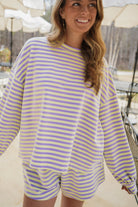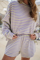 Effortless comfort meets playful style with the Shelly Set! This oversized long sleeve tee features a striking horizontal color block stripe design in vibrant lime and soft lavender, paired with matching comfy elastic waist bottoms for a coordinated look. Perfect for lounging, running errands, or casual hangouts—slip it on and feel the ease of relaxed-fit fashion that doesn't compromise on personality.