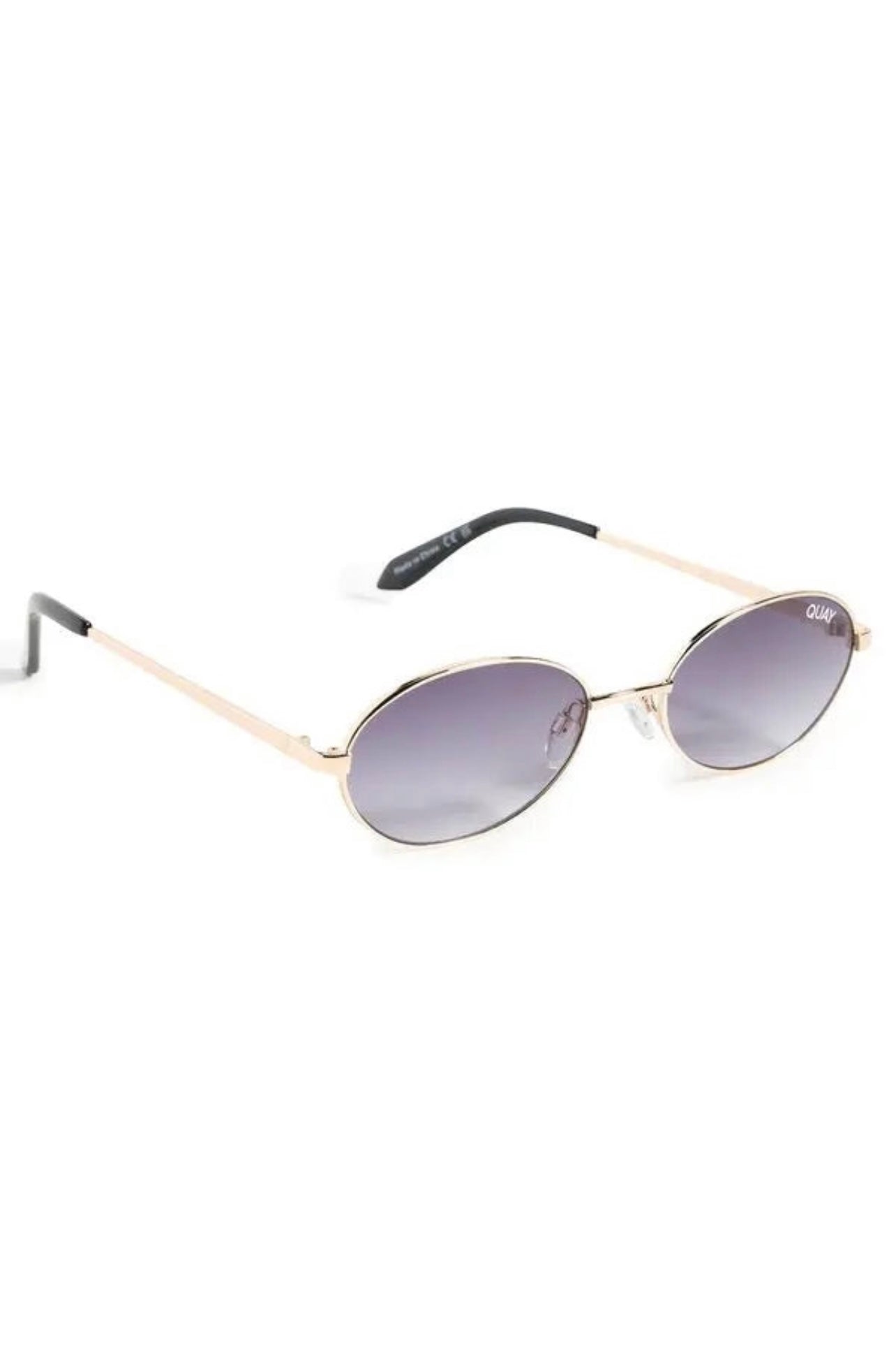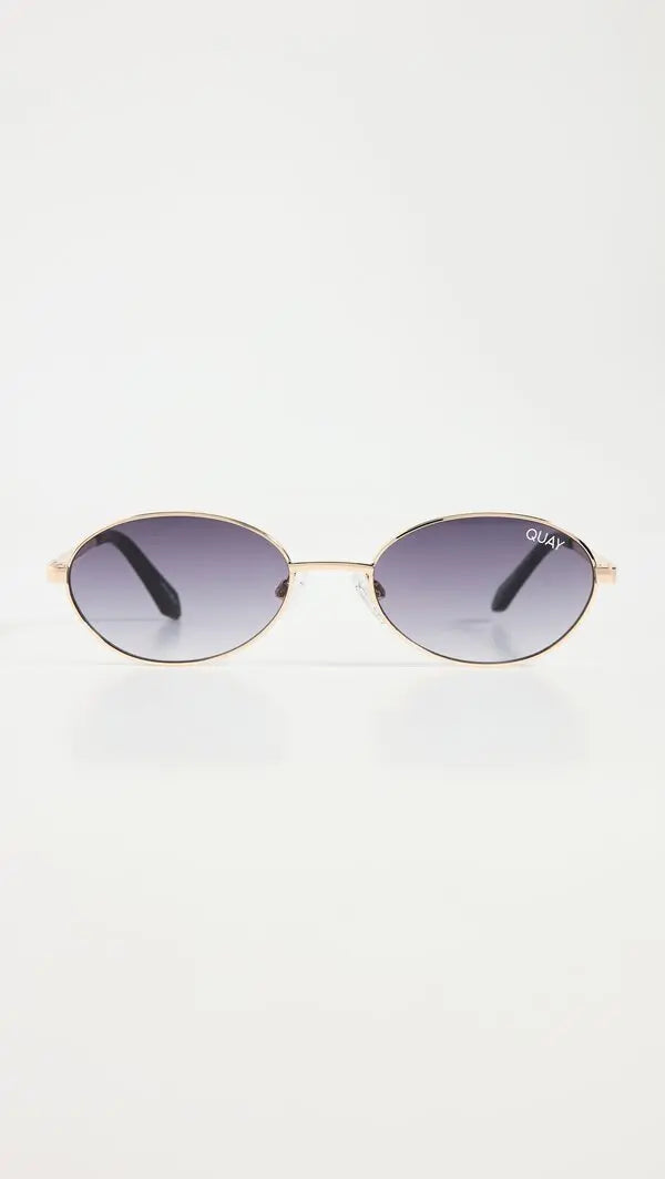 Polished gold-tone hardware. Adjustable nose pads. Soft case included. Oval frame. Non-polarized lenses. Imported, China. Metal frame. Plastic lenses. Measurements: Width: 5.5in / 14cm Height: 1.5in / 4cm Lens Width: 48mm
