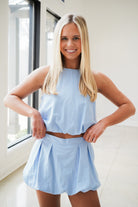 Elevate your wardrobe with the Anabella Set! This stunning set features a sleeveless high neckline blouse with a chic balloon hem and a matching balloon skort with a back zipper. Perfect for any occasion, this set will have you looking and feeling confident and stylish. Don't miss out on this must-have addition to your closet!