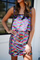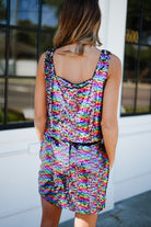 The Sugar Set features a short features a sequin cropped tank top with wide shoulder straps, and sequin mini skirt with a zipper closure.