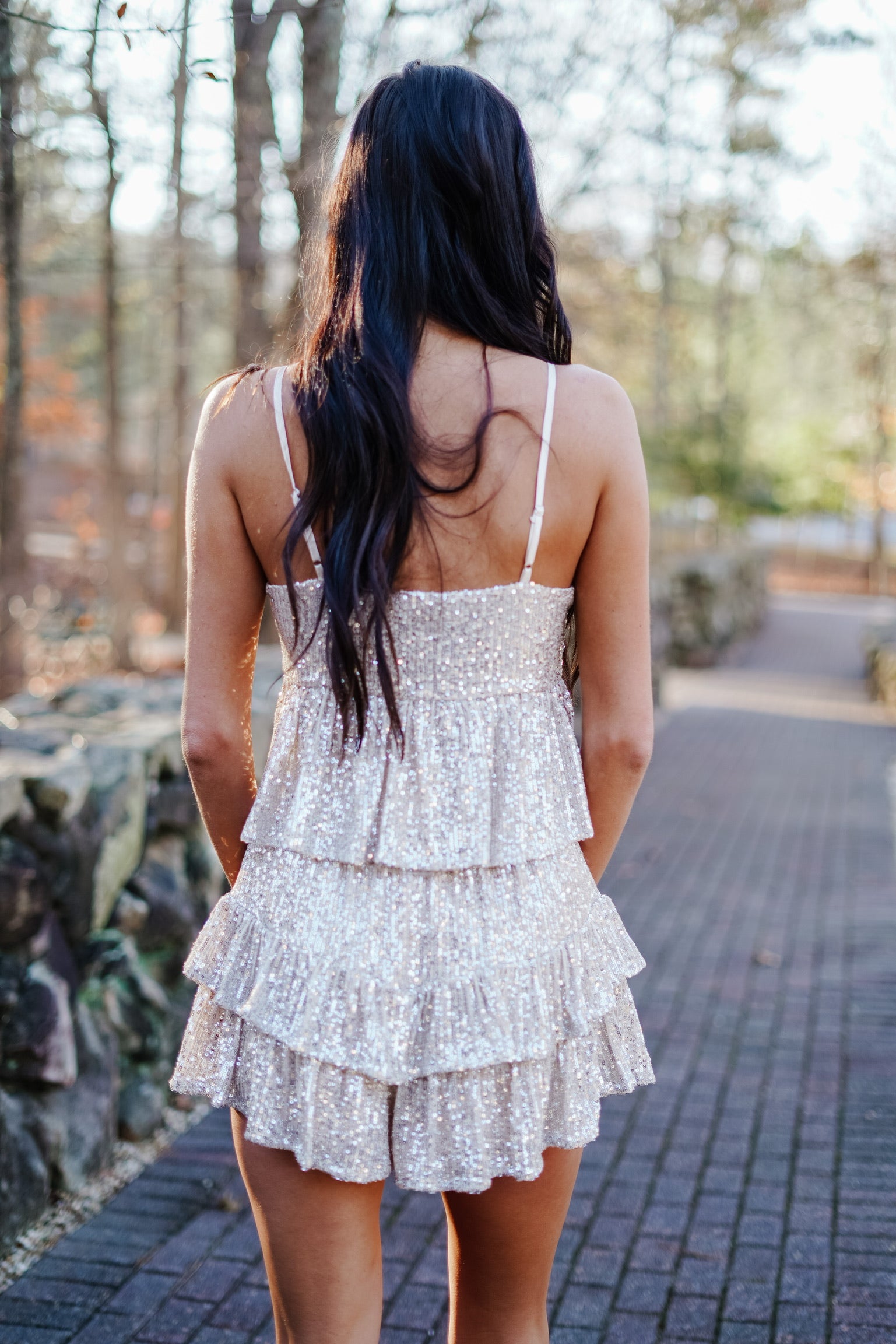 Sequin twisted ruffled tank top features a flowy + flirty bottom ruffle, adjustable straps, and pair perfect with the Chula Vista Skort!