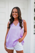 Stunning in satin v-neck sleeveless lined tank is effortless for spring! Style with denim or pair back to the Trina Pant for a dressy set. Great length and perfect for so many occasions!