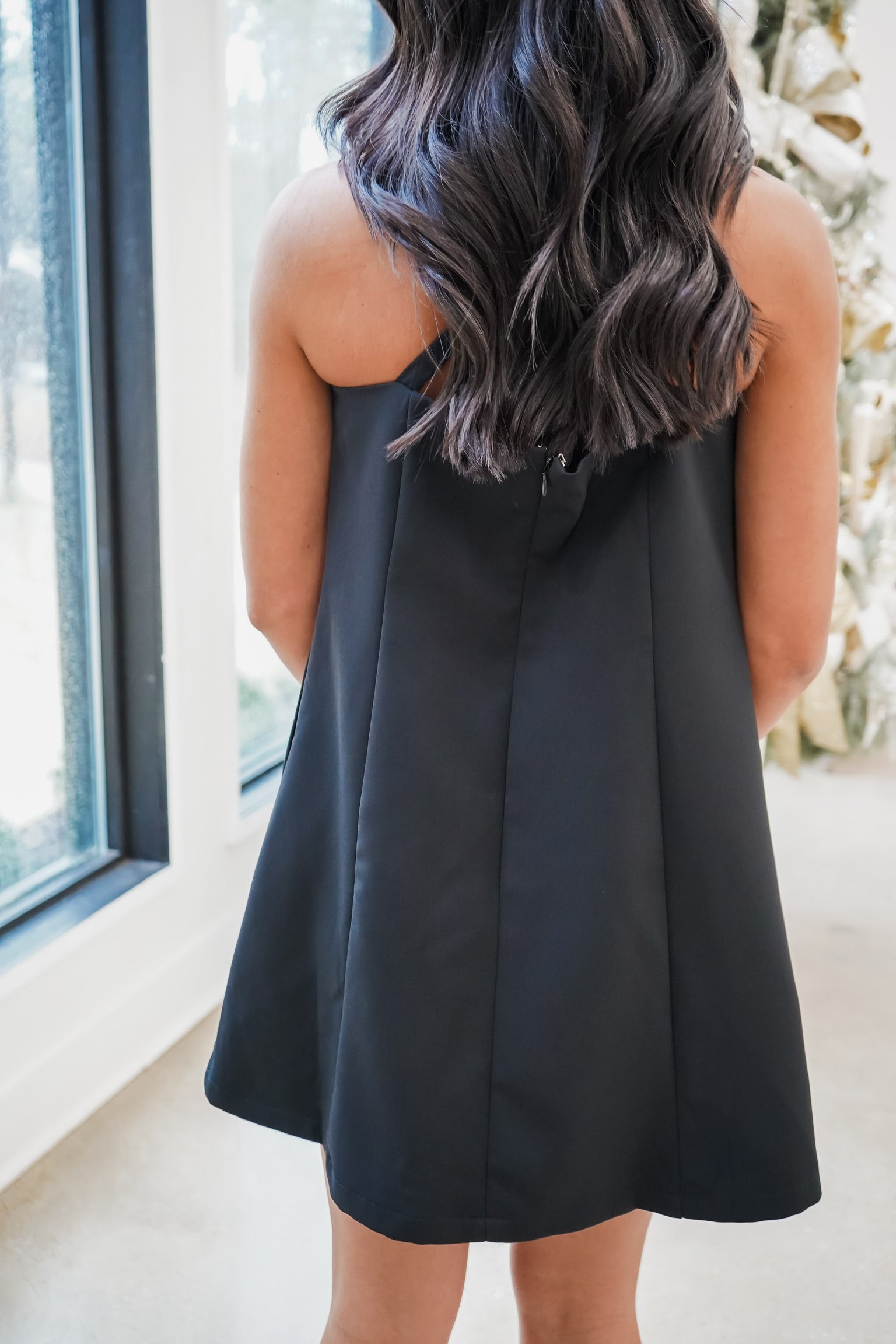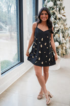 Slip into pure destiny with this show-stopping mini dress! The sleeveless silhouette and flattering v-neckline frame you beautifully, while the A-line hem creates an effortlessly chic flow. A hidden back zipper ensures a smooth fit, and here's where the magic happens—shimmering metallic gold 3D embellishments catch the light with every move, transforming this dress into a head-turning statement piece. Perfect for nights when you want to shine brighter than the rest.