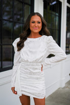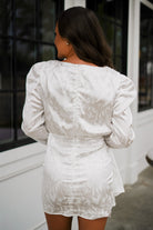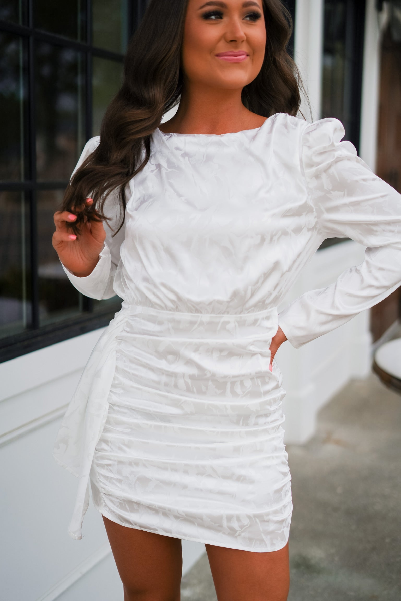 Beautiful + angelic in white! Get GNO ready in this beautiful ruched puff sleeve satin jacquard mini dress! With a drape and side gathered detail, this will definitely make you stand out!